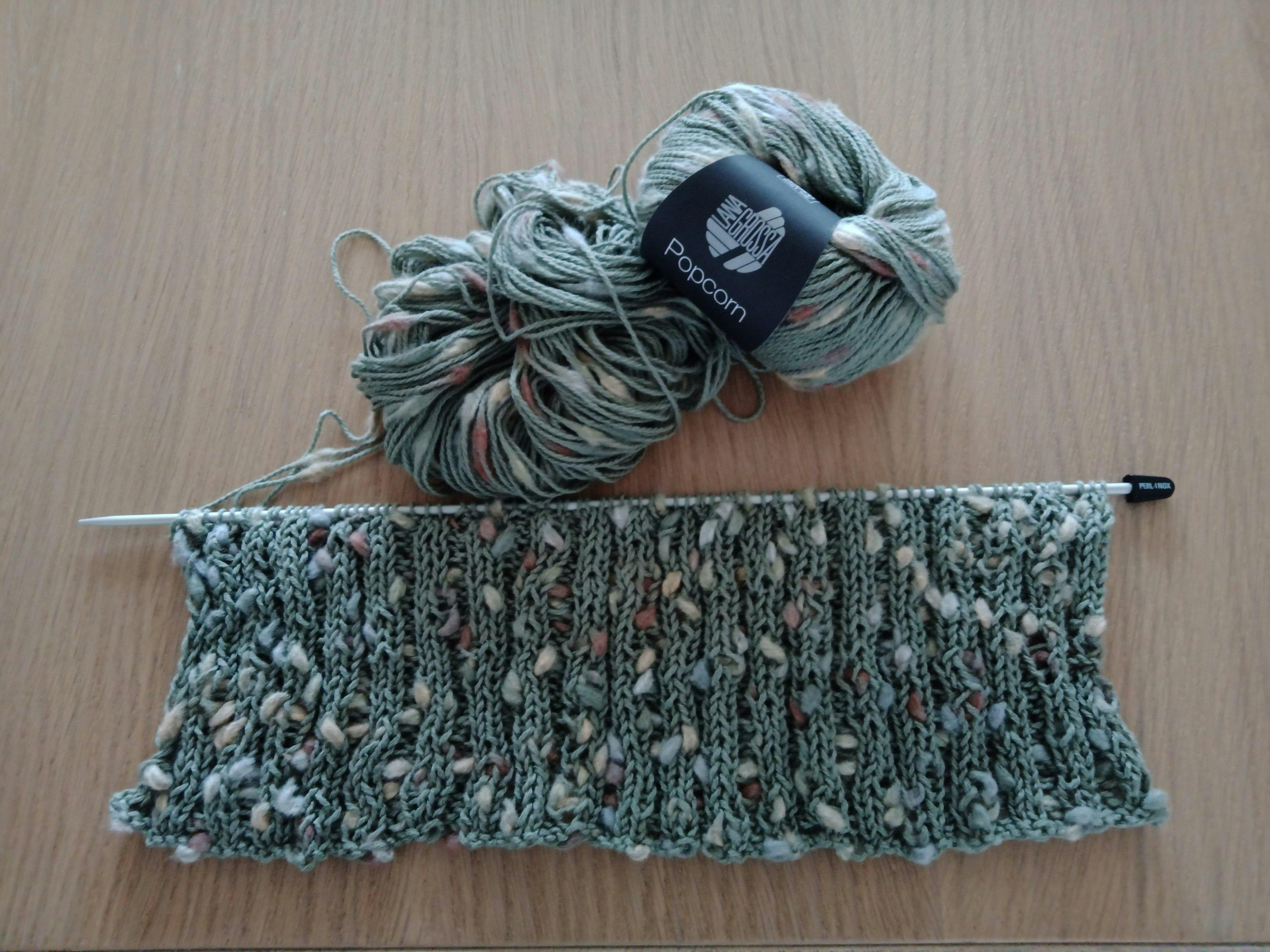 Dit wordt een sjaal voor mijn dochter. Ze wou iets groen met een accent erin. Deze popcorn wol is daar ideaal voor. Het is ook heel leuk om ermee te breien.