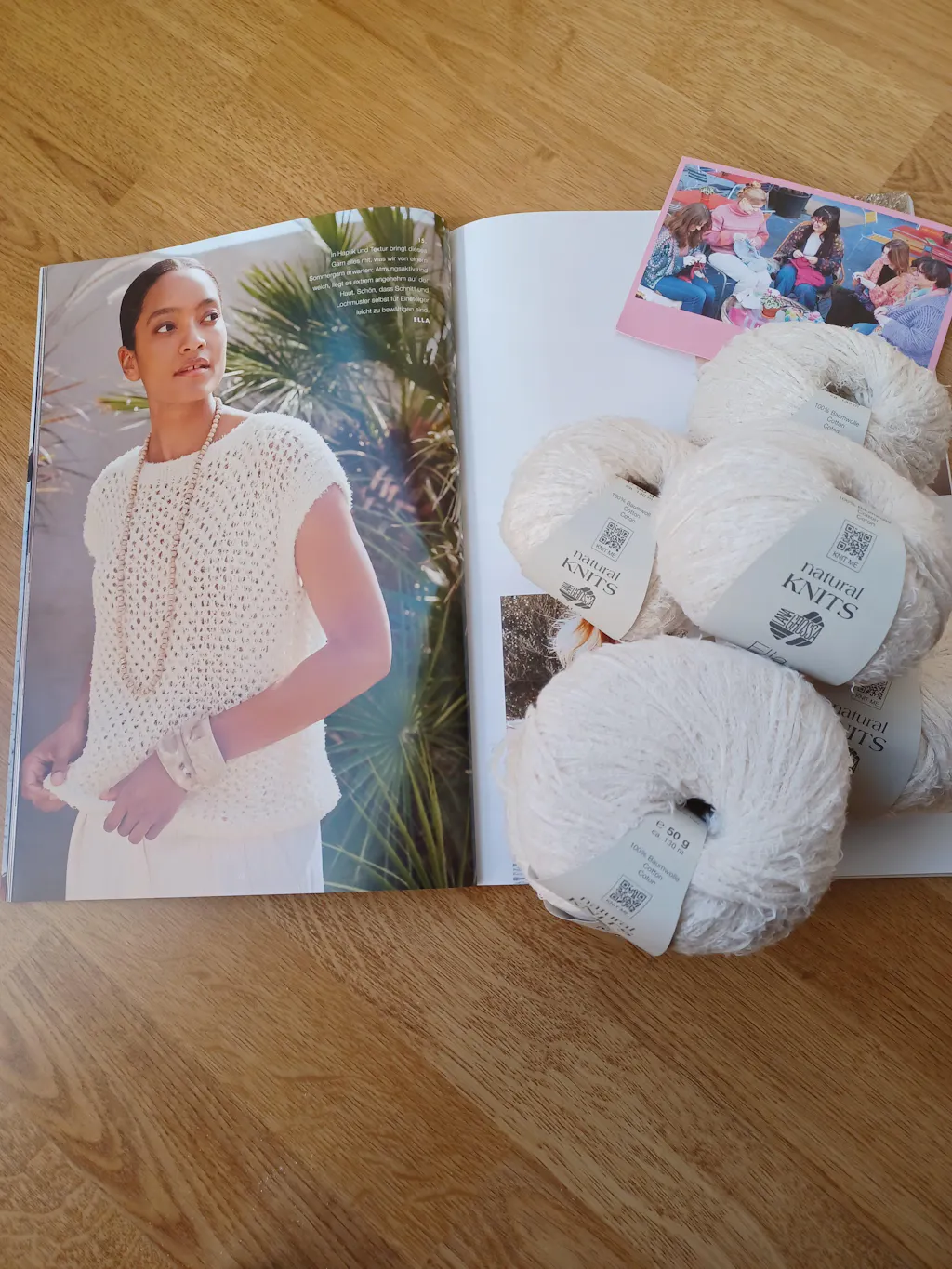 Prachtig garen met een heel mooi kleurverloop. Het shirt wordt gebreid in een ajoursteek. Goed te doen, maar wel je aandacht wat meer erbij houden zodat je geen fouten maakt. Ik verwacht het resultaat stoer te kunnen dragen op een lichte jeans van de zomer.