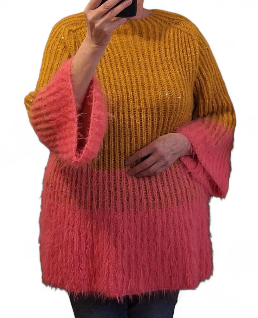Ik was meteen verliefd op het model maar wilde andere kleuren dan welke je uit kon kiezen. Ik heb gekozen voor roze Basta 008 en Cool Merino 035. Later besloot ik dat het nog wel wat opvallender kon en heb de Glamour 0018 met de Cool Merino om de 10 naalden voor 10 naalden meegebreid. Dat gaf een sprankelend effect. Waar ik niet zo rekening mee gehouden heb is dat de Cool Merino heel erg pluist en ook zal gaan pillen. En laat ik nou 'n hekel hebben aan pillen. Het breien van de de patentsteek was voor mij nieuw. Ik ben ook wel 5 keer opnieuw begonnen met het voorpand omdat ik in toeren wilde breien. Maar als je niet oplet kan het gebeuren dat je na de eerste toer en je steken liggen niet goed op 1 lijn, dat je na zo'n 40 toeren ontdekt dat de 1e toer verdraaid op de naald lag. Ik heb de trui in maat 44/46 gebreid maar voor maat 48/50 aan wol besteld omdat ik de lengte van de trui 7 cm langer wilde. Betreft de mouwen heb volgens het patroon de opgeven centimeters gebreid, wat achteraf ook wat langer had gemogen. Al met al ben ik heel blij met het resultaat.