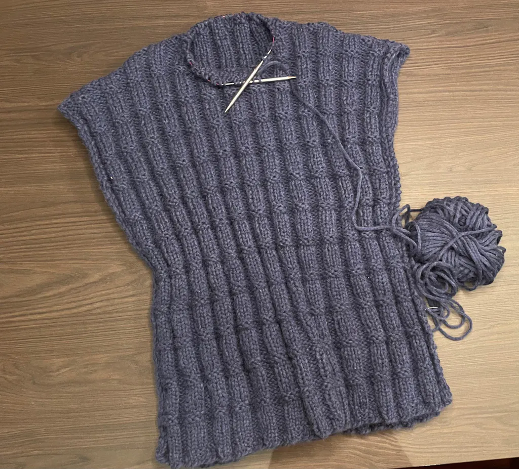 De spencer is bijna helemaal af en hier wordt ik helemaal blij van. Nog even de hals afmaken en de zijkanten een stukje vast zetten.