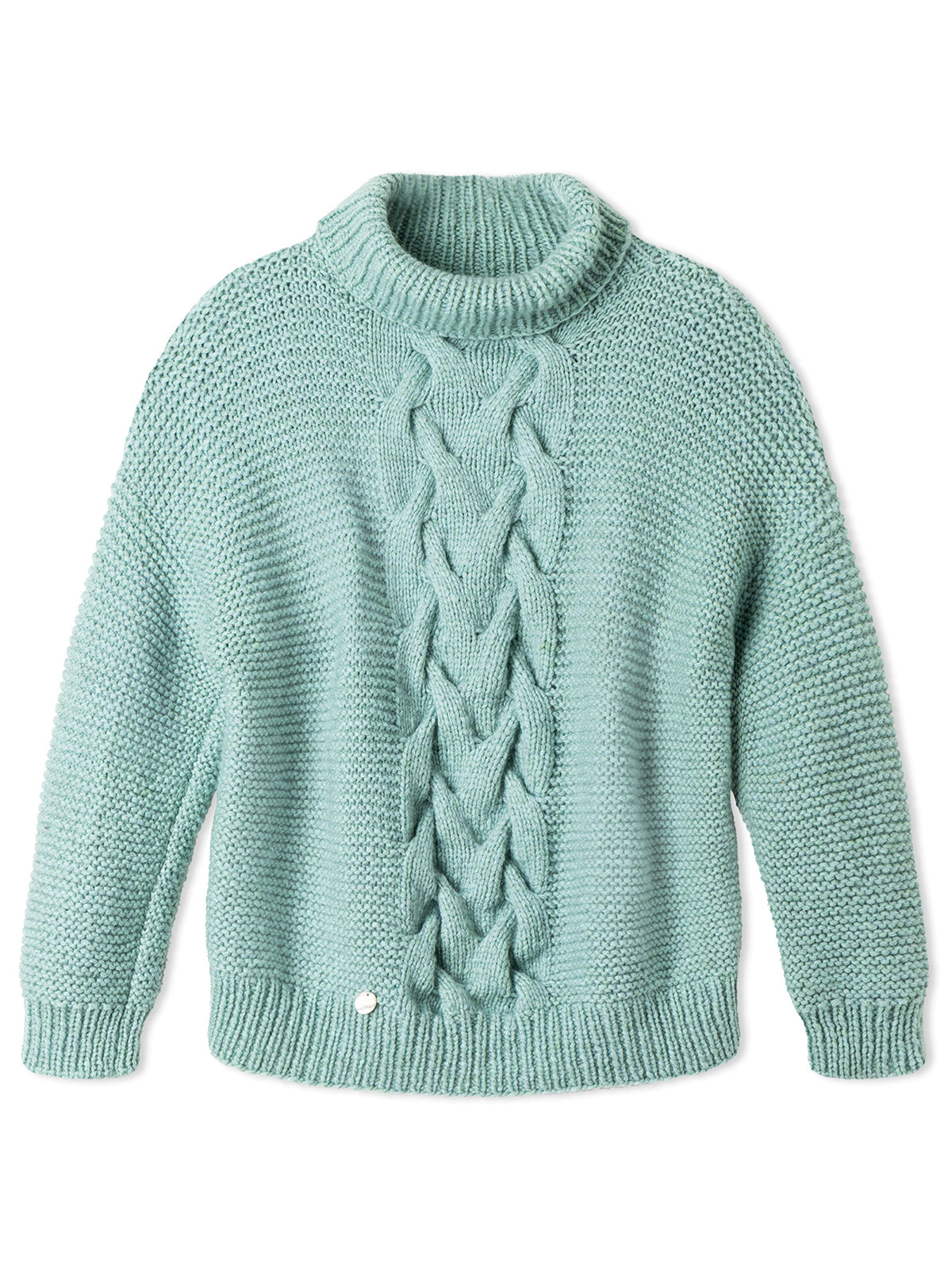 Deze heerlijk knusse trui heeft een lage col en grote kabels over het midden lopen. De trui wordt in panden gebreid, op het einde brei je de halsboord er op rondbreinaalden aan vast.