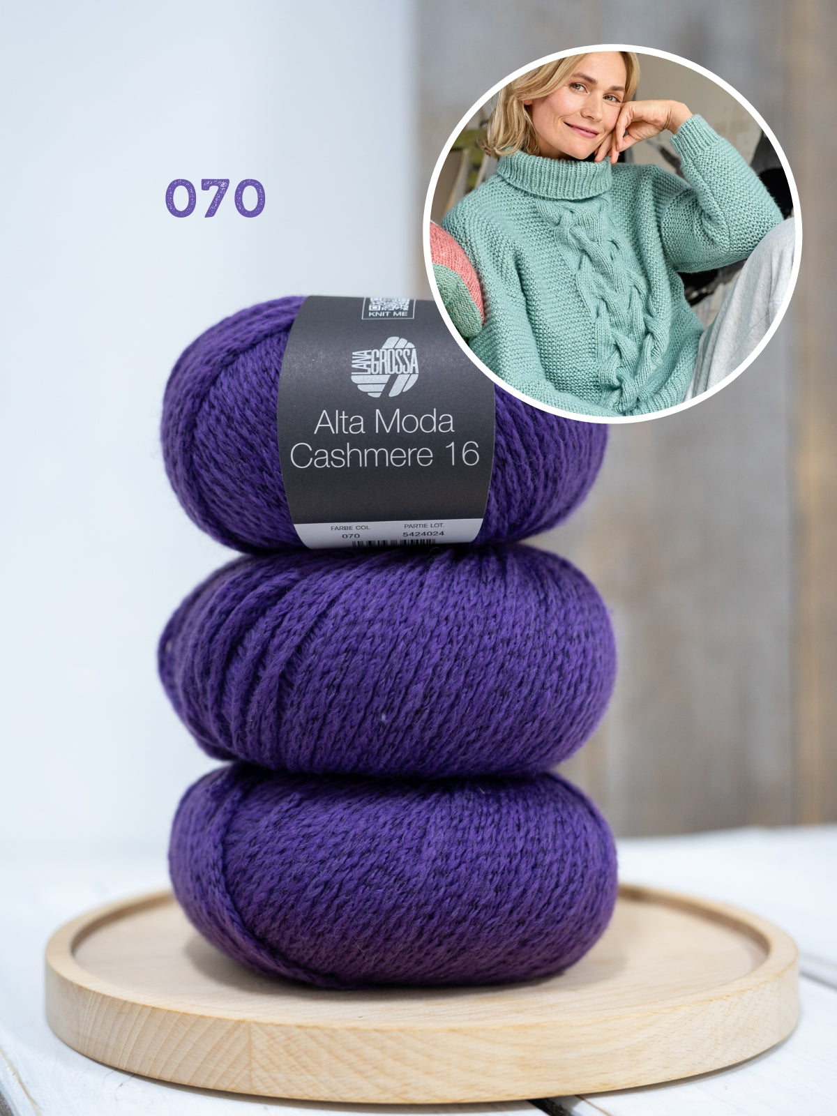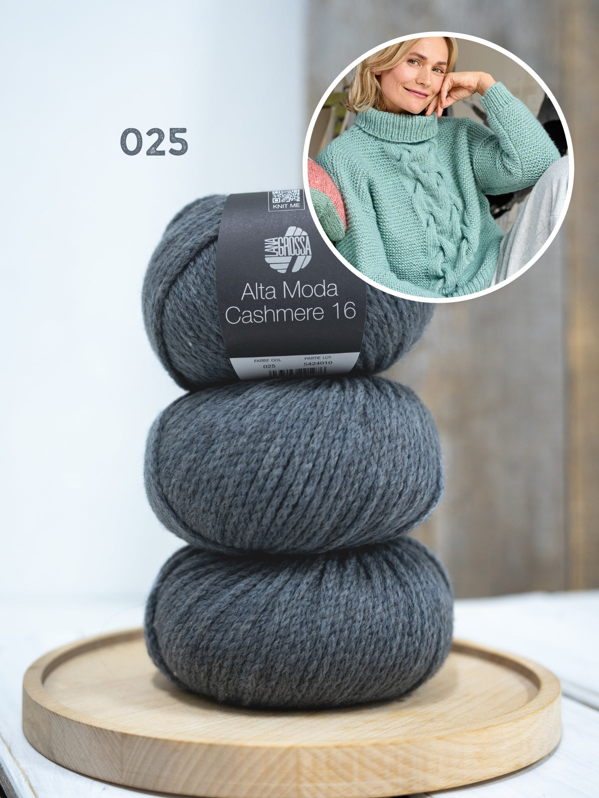 Het pakket bestaat uit 11/12/13 bollen Alta Moda Cashmere 16 en het Filati Home 78 magazine van Lana Grossa. De benodigde breinaalden (7mm, 8mm en naaldpunten 7mm met draad 50cm en eventueel een kabelnaald) kun je hieronder toevoegen aan je winkelmandje.