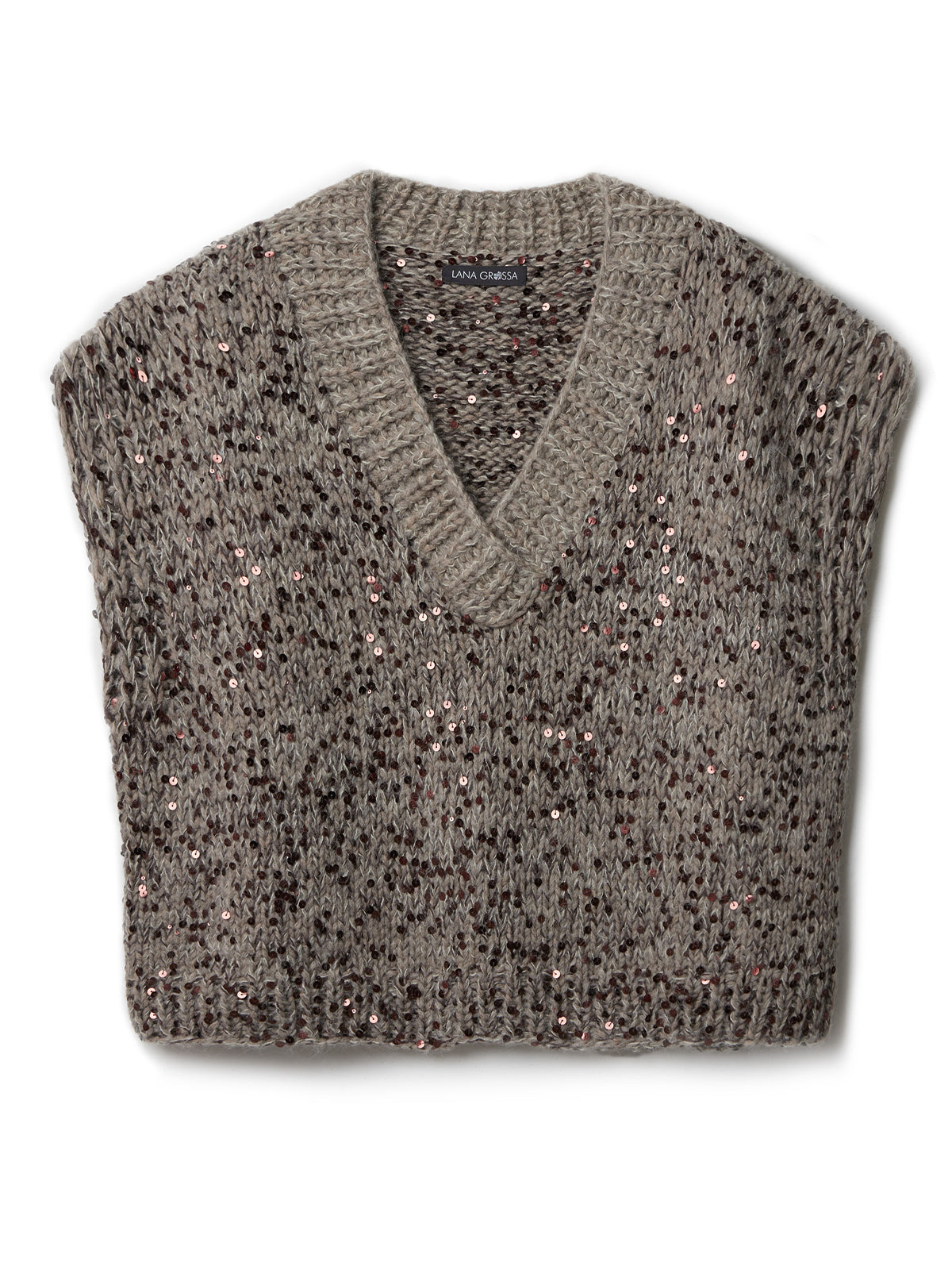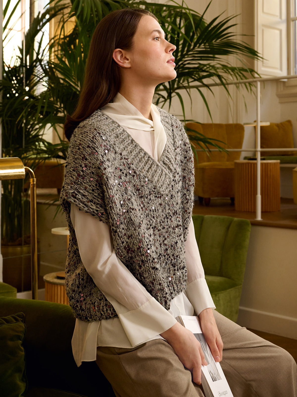 Deze spencer wordt gebreid met Alta Moda Cashmere 16 (78% merinowol, 12% kasjmier, 10% nylon), Setasuri (69% suri alpacawol, 31% zijde) en Cosmo (100% katoen + pailletten). Het patroon is uitgeschreven in maat 36 t/m 50.