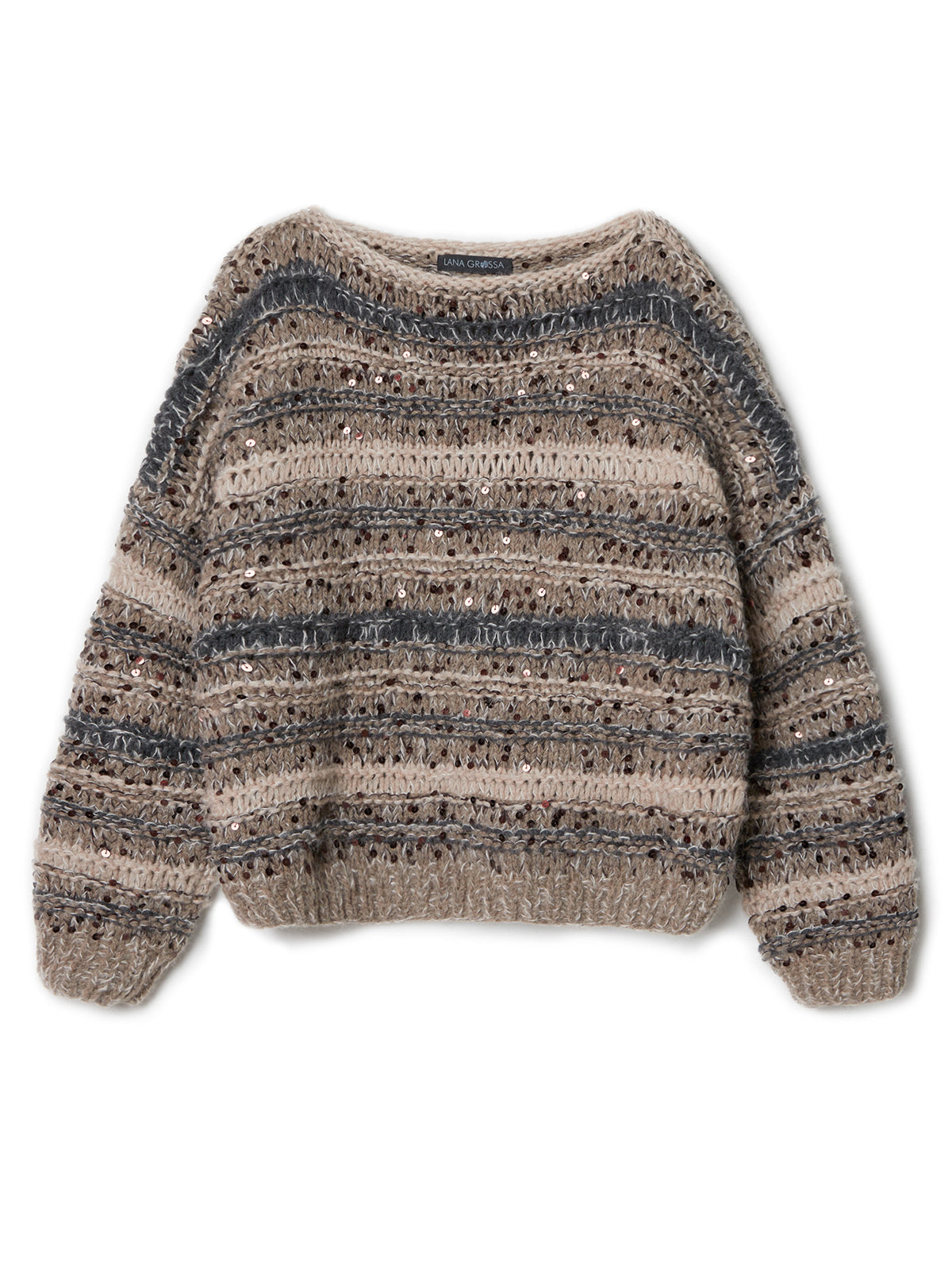 Deze trui wordt gebreid met Alta Moda Cashmere 16 (78% merinowol, 12% kasjmier, 10% nylon), Setasuri (69% suri alpacawol, 31% zijde) en Cosmo (100% katoen + pailletten). Het patroon is uitgeschreven in maat 36 t/m 50.