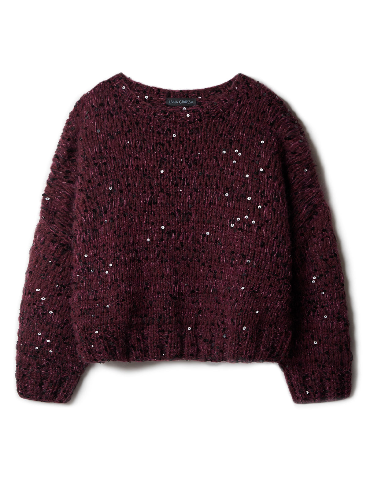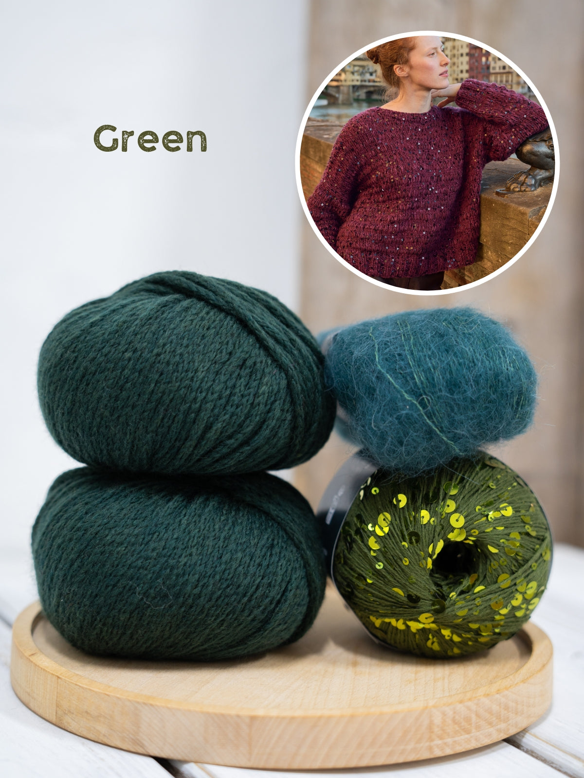Deze trui wordt gebreid met Alta Moda Cashmere 16 (78% merinowol, 12% kasjmier, 10% nylon), Setasuri (69% suri alpacawol, 31% zijde) en Cosmo (100% katoen + pailletten). Het patroon is uitgeschreven in maat 36 t/m 50.