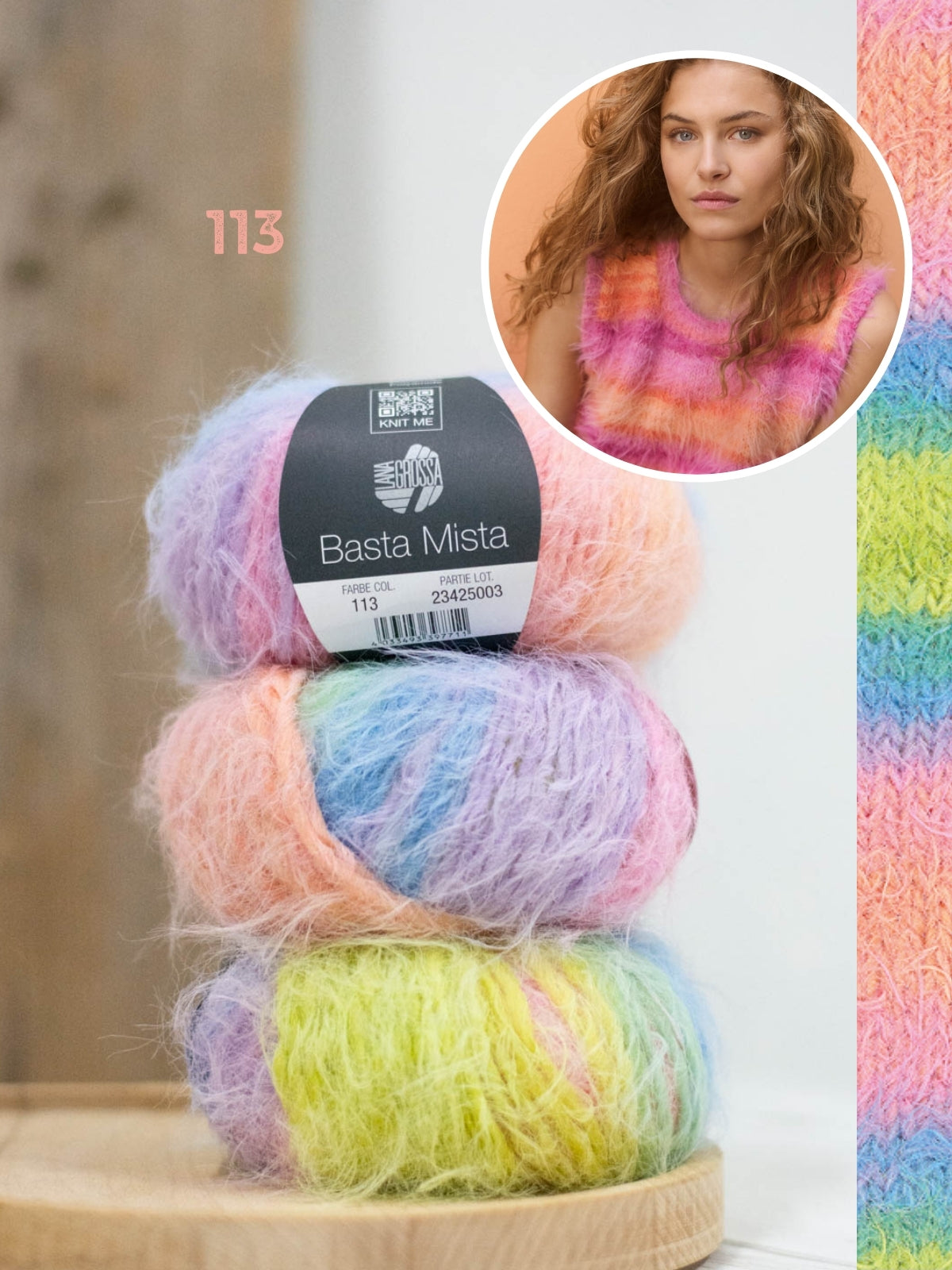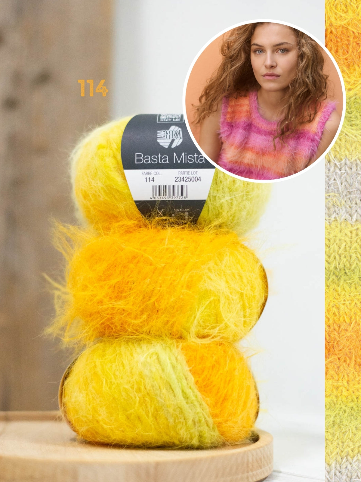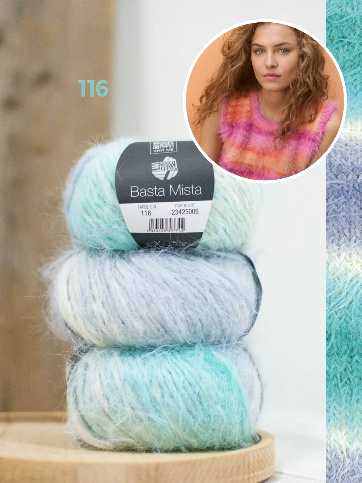 Het pakket bestaat uit 5/6 bollen Basta Mista en het Lookbook 20 magazine van Lana Grossa. De benodigde breinaalden (naaldpunten 4mm en 6mm, korte naaldpunten 4mm, draad 40cm en 60cm of 80cm) kun je hieronder toevoegen aan je winkelmandje.