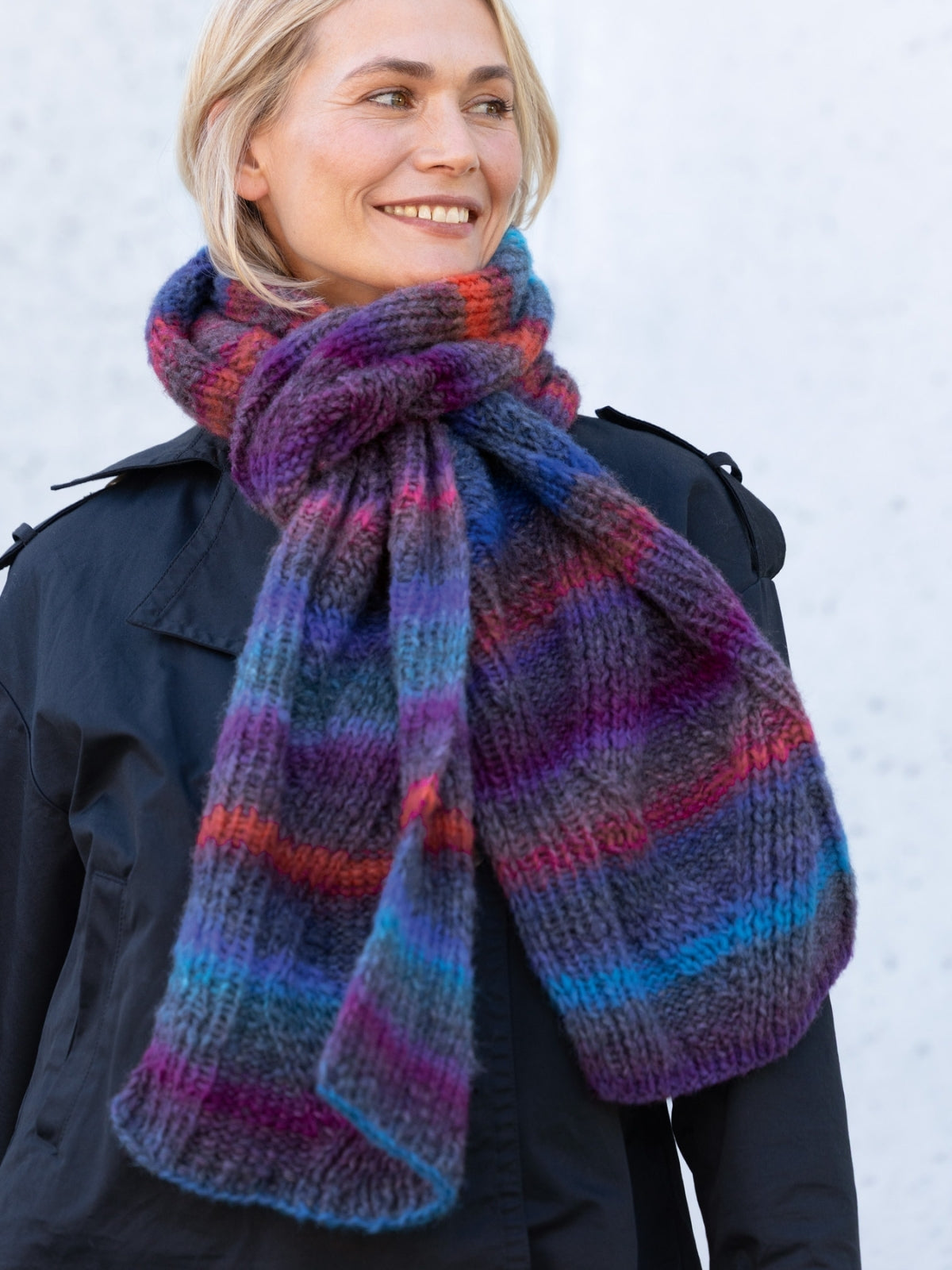 Bomba is een ideaal garen voor knusse sjaals! Dankzij de pluis en het leuke kleurverloop krijg je niet alleen een heerlijk warme sjaal, maar ook zeker een unieke! Deze sjaal heeft brede kabels.