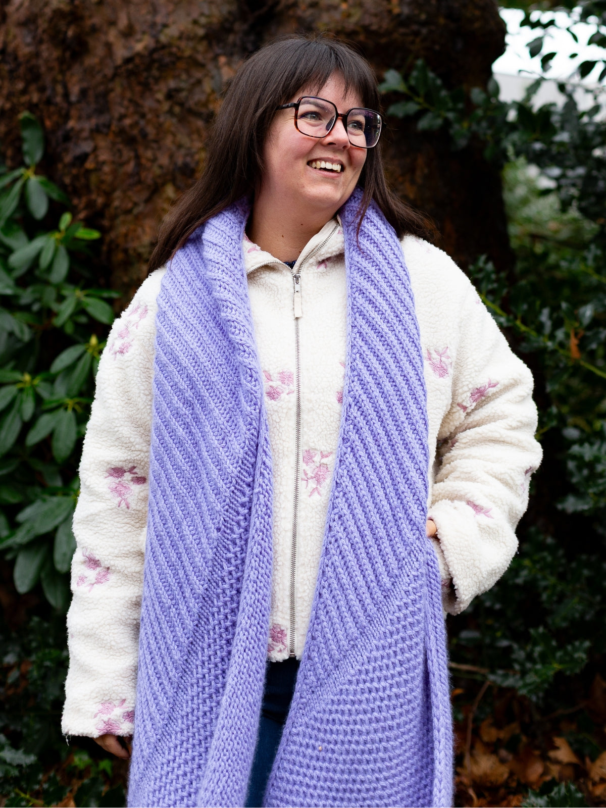 De Bombadil sjaal is een heerlijk knusse sjaal vol textuur! Je breit twee variaties van patentsteek, die een fijn ritme hebben wanneer je ze eenmaal onder de knie hebt. De sjaal wordt op de diagonaal gebreid, waardoor je schuine lijnen krijgt.