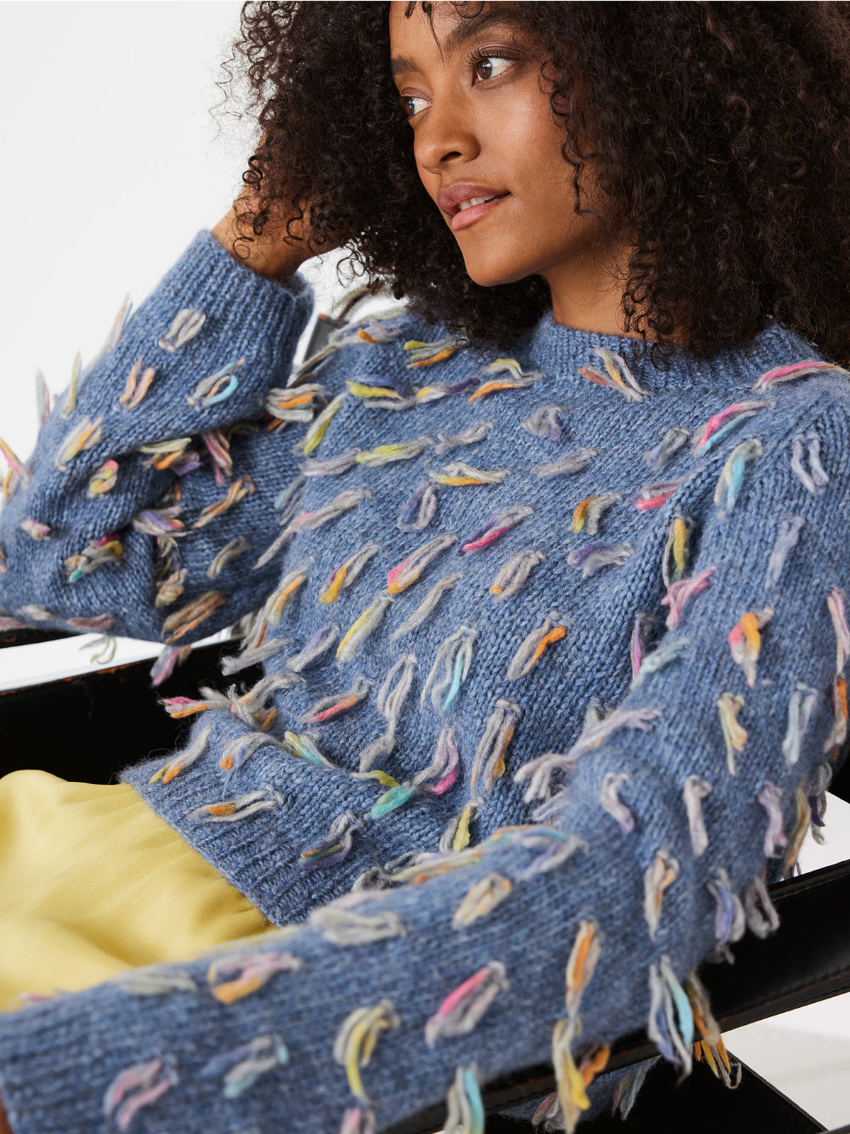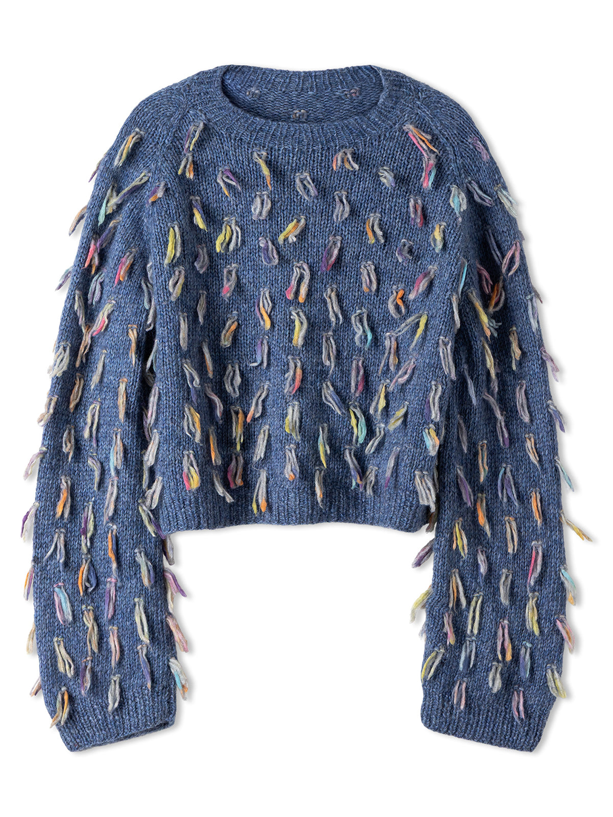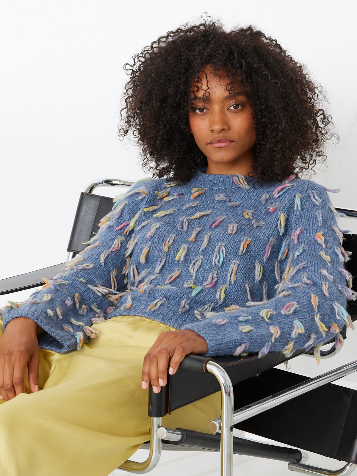 Deze trui is simpel in basis, maar door een andere draad erbij te houden en de uiteindes voor te laten hangen creëer je deze leuke franjes! De trui wordt in panden gebreid, wanneer de trui in elkaar is gezet brei je de halsboord eraan op korte rondbreinaalden.