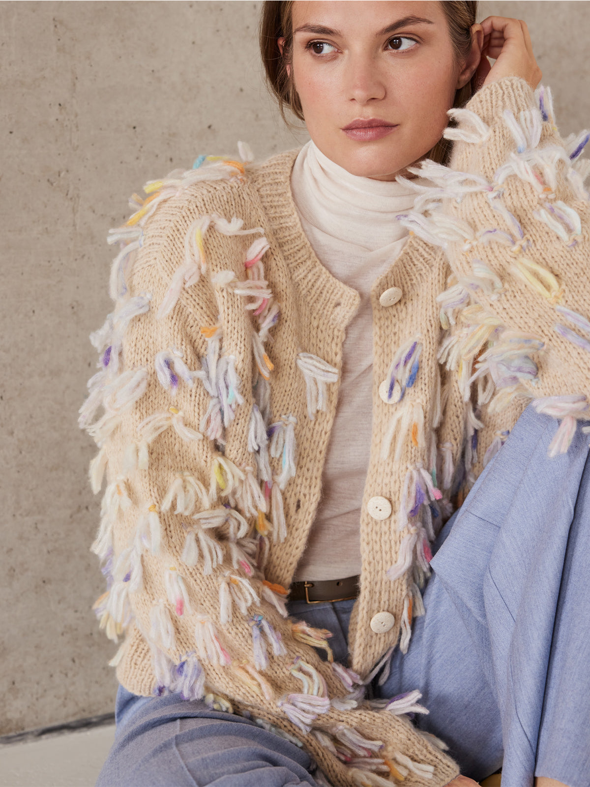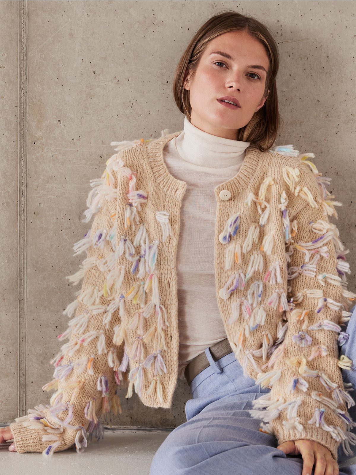 Dit vest is simpel in basis, maar door een andere draad erbij te houden en de uiteindes voor te laten hangen creëer je deze leuke franjes! Het vest wordt in panden gebreid, wanneer de trui in elkaar is gezet brei je de halsboord eraan op rondbreinaalden.