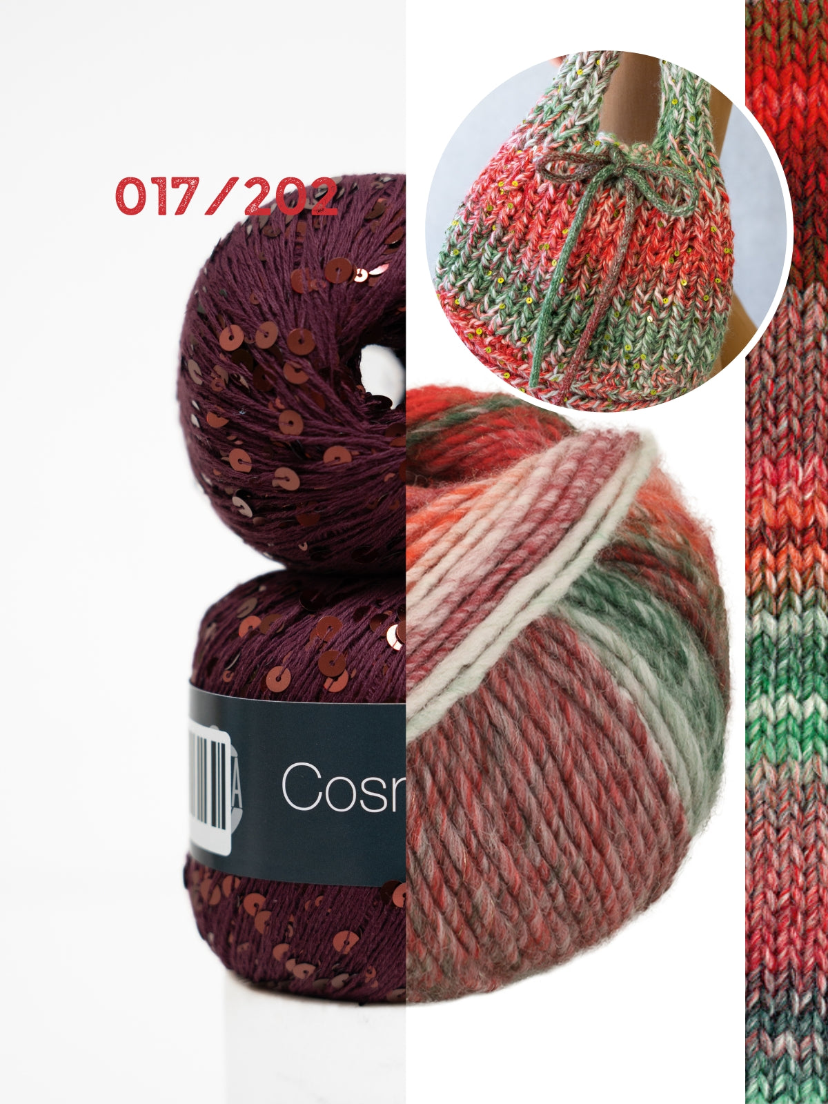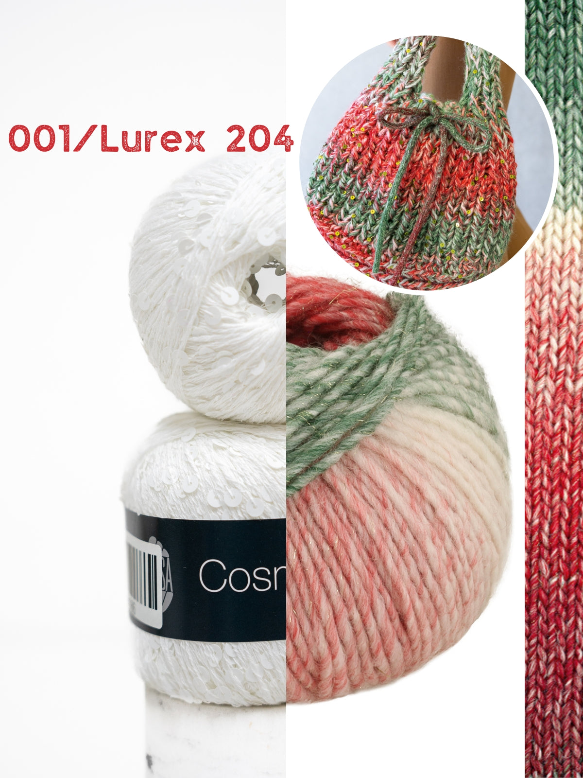 De tas wordt gebreid met Christmas Edition Big (60% wol, 40% acryl) en Cosmo (100% katoen + pailletten). De tas wordt ca 38cm x 29cm exclusief hengsel.
