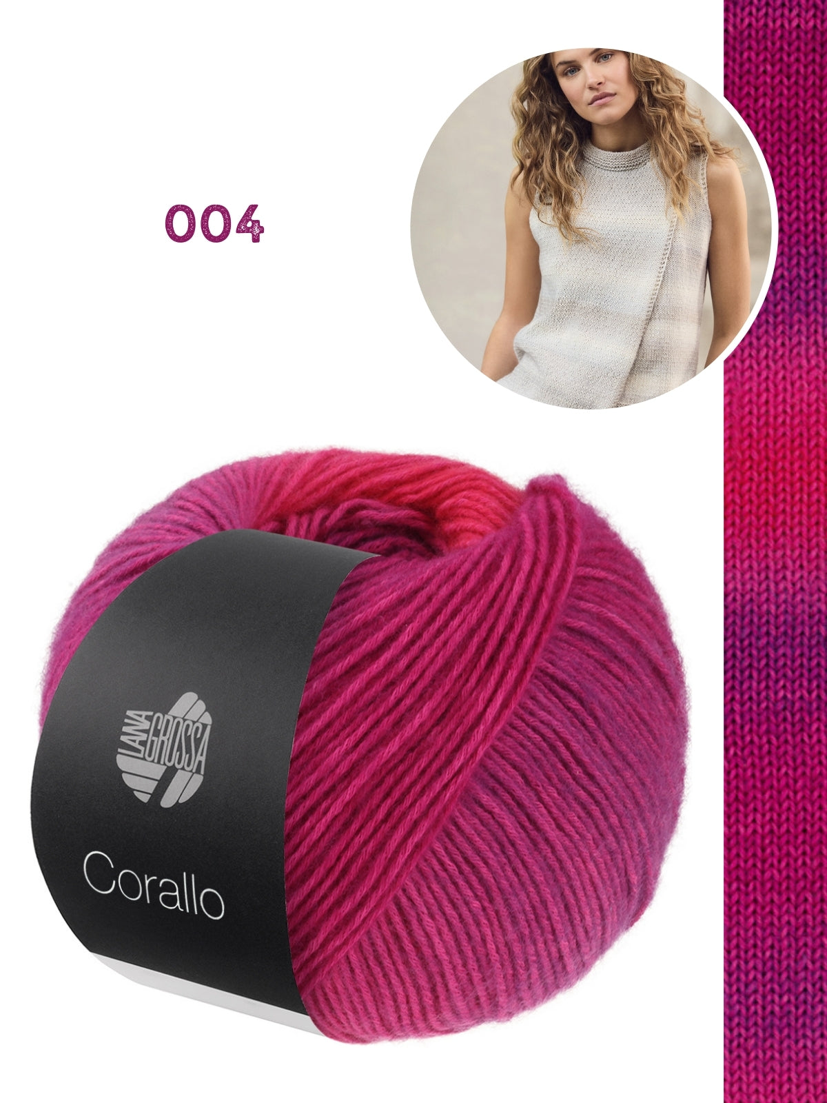 Het pakket bestaat uit 4/5/6 bollen Corallo en het Lookbook 20 magazine van Lana Grossa. De benodigde breinaalden (4mm en 4.5mm, korte naaldpunten 4mm met draad 40cm) kun je hieronder toevoegen aan je winkelmandje.