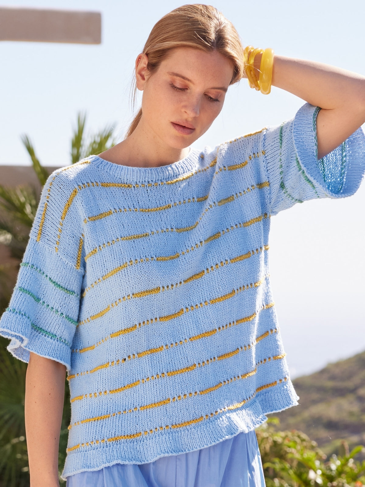 Dit shirt heeft een ronde hals en leuke smalle streepjes met een verloop garen. Dit geeft het simpele shirt toch een speels effect! Het shirt wordt van boven naar beneden (top-down) in het rond gebreid.