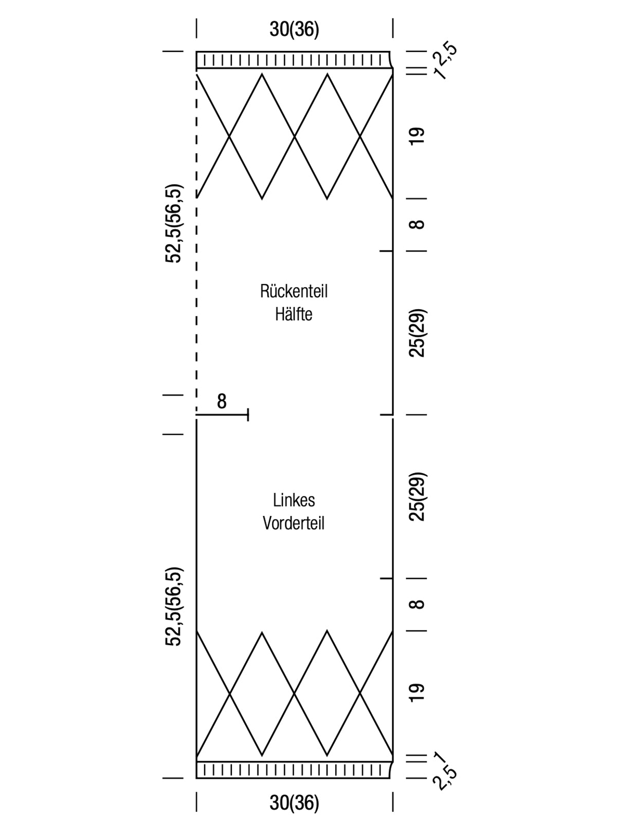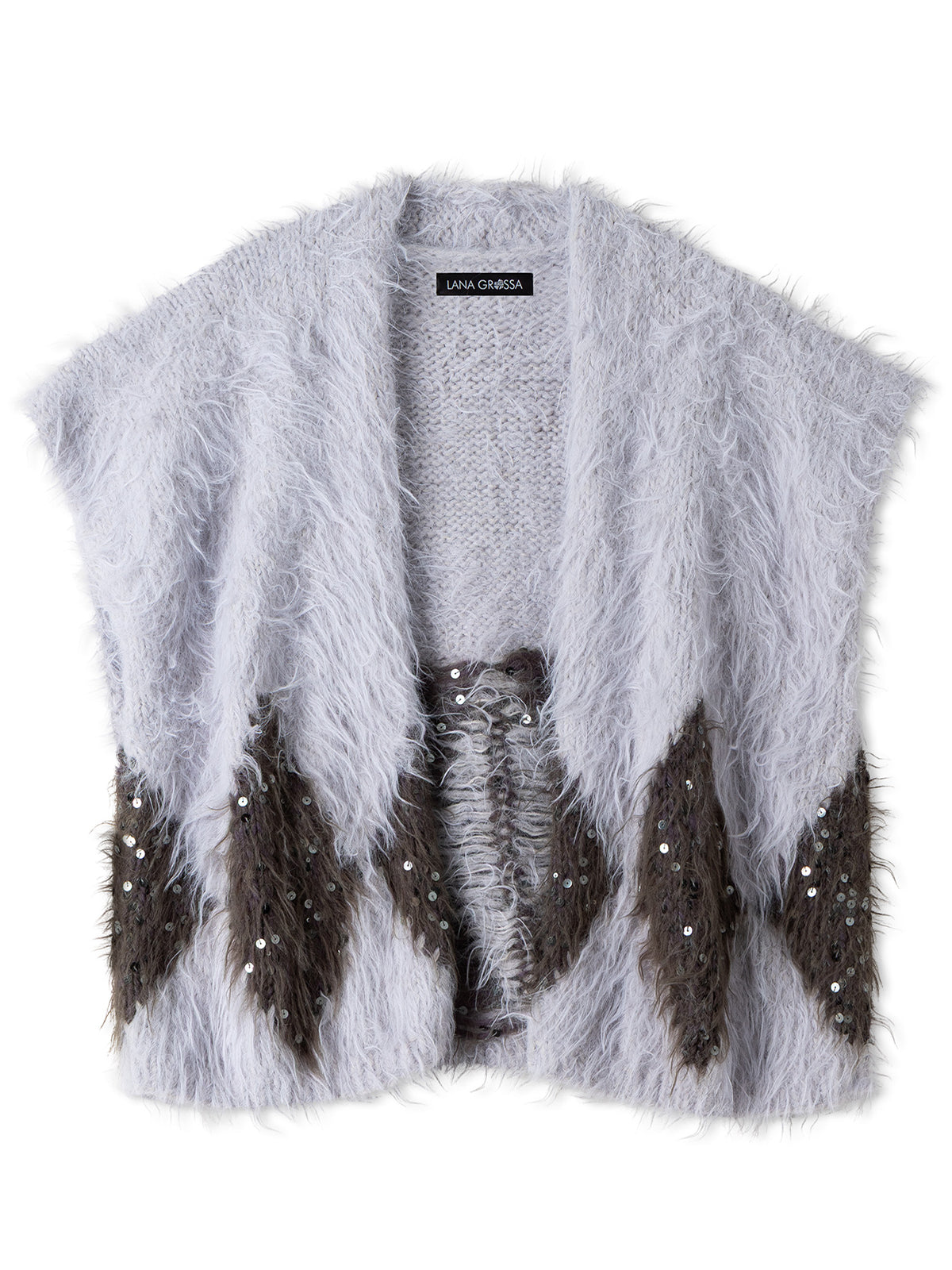 Het gilet wordt gebreid met Ecopuno (72% katoen, 17% wol, 11% Alpaca), Basta (50% wol en 50% polyamide) en Cosmo (100% katoen plus pailletten). Het patroon is uitgeschreven in maat 36 t/m 50.