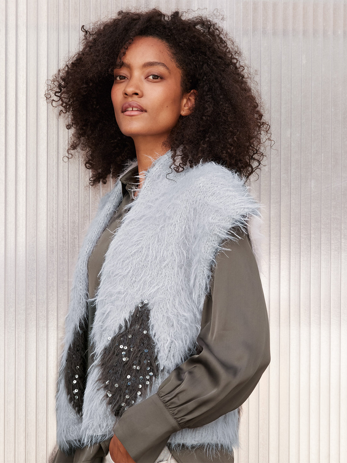 Dit gilet is niet alleen erg knus, ook stijlvol met ingebreide delen met pailetten! De kleur die je niet gebruikt neem je aan de achterkant van het werk losjes mee. Het gilet wordt in 2 lange panden gebreid, tijdens het breien houd je altijd twee draden samen (Basta + Ecopuno of Basta + Cosmo).