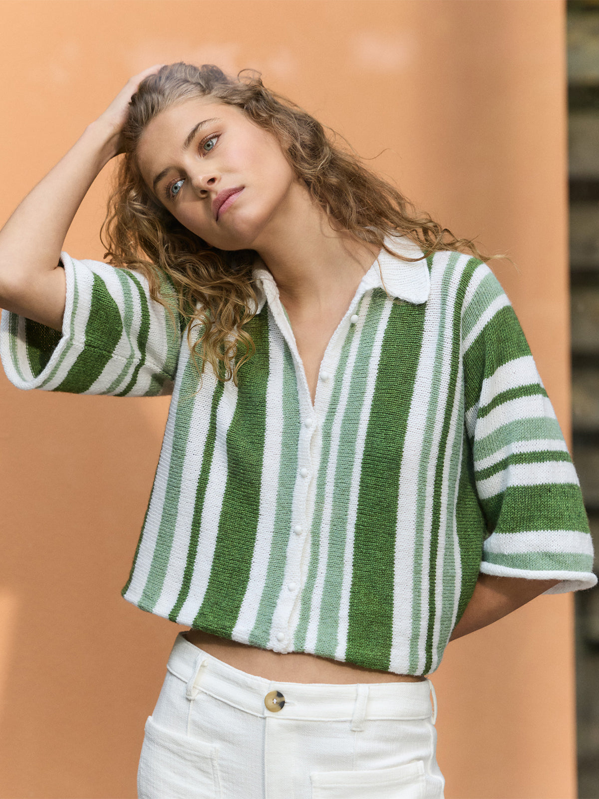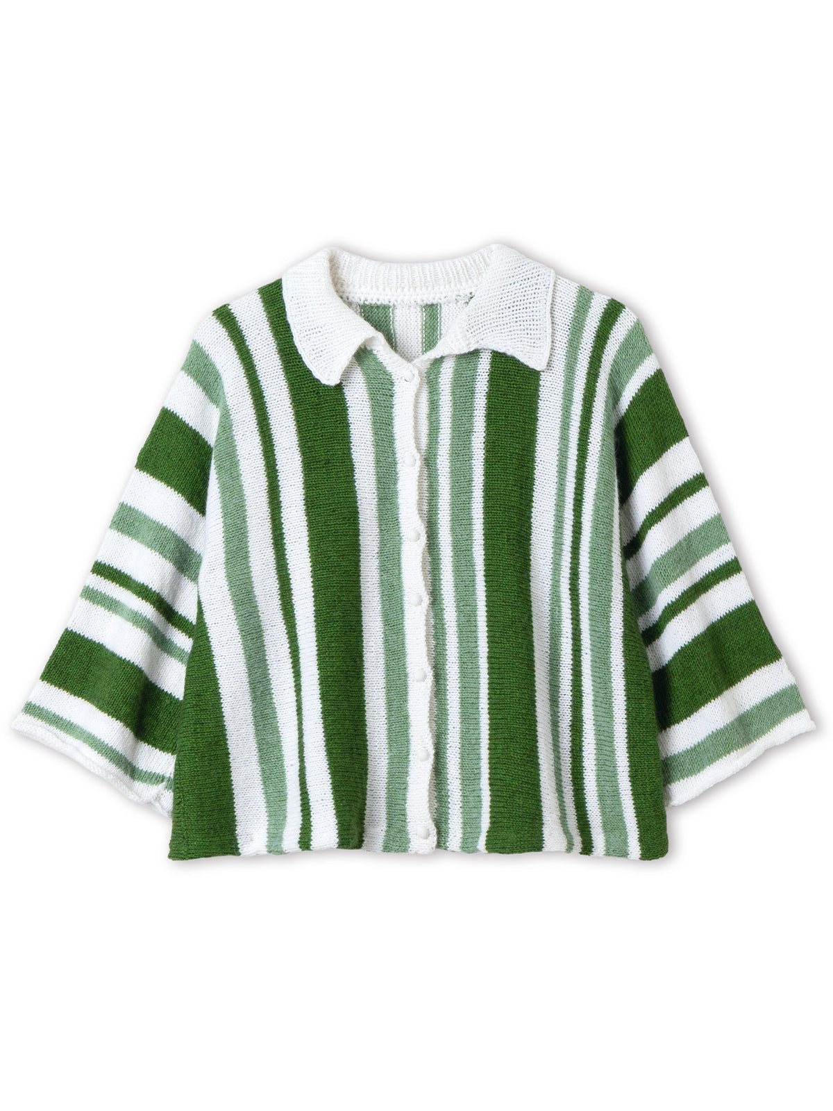 Dit leuke shirtje met polo nek en korte mouwen waren wij meteen verliefd op! Het wordt gebreid in één stuk, begonnen bij de rechtermouw en zijwaarts gebreid naar de linkermouw. Hierdoor creëer je verticale strepen.