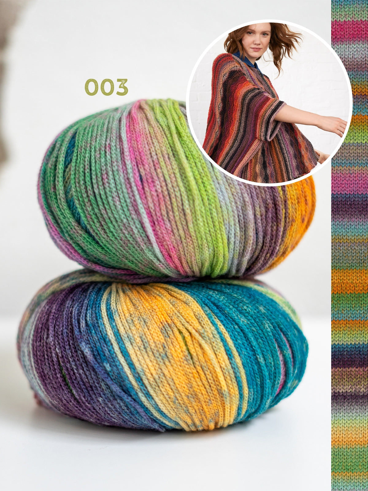 Deze poncho heeft verschillende steken erin, gecombineerd met het zelf strepende garen zorgt dit voor een speels effect!