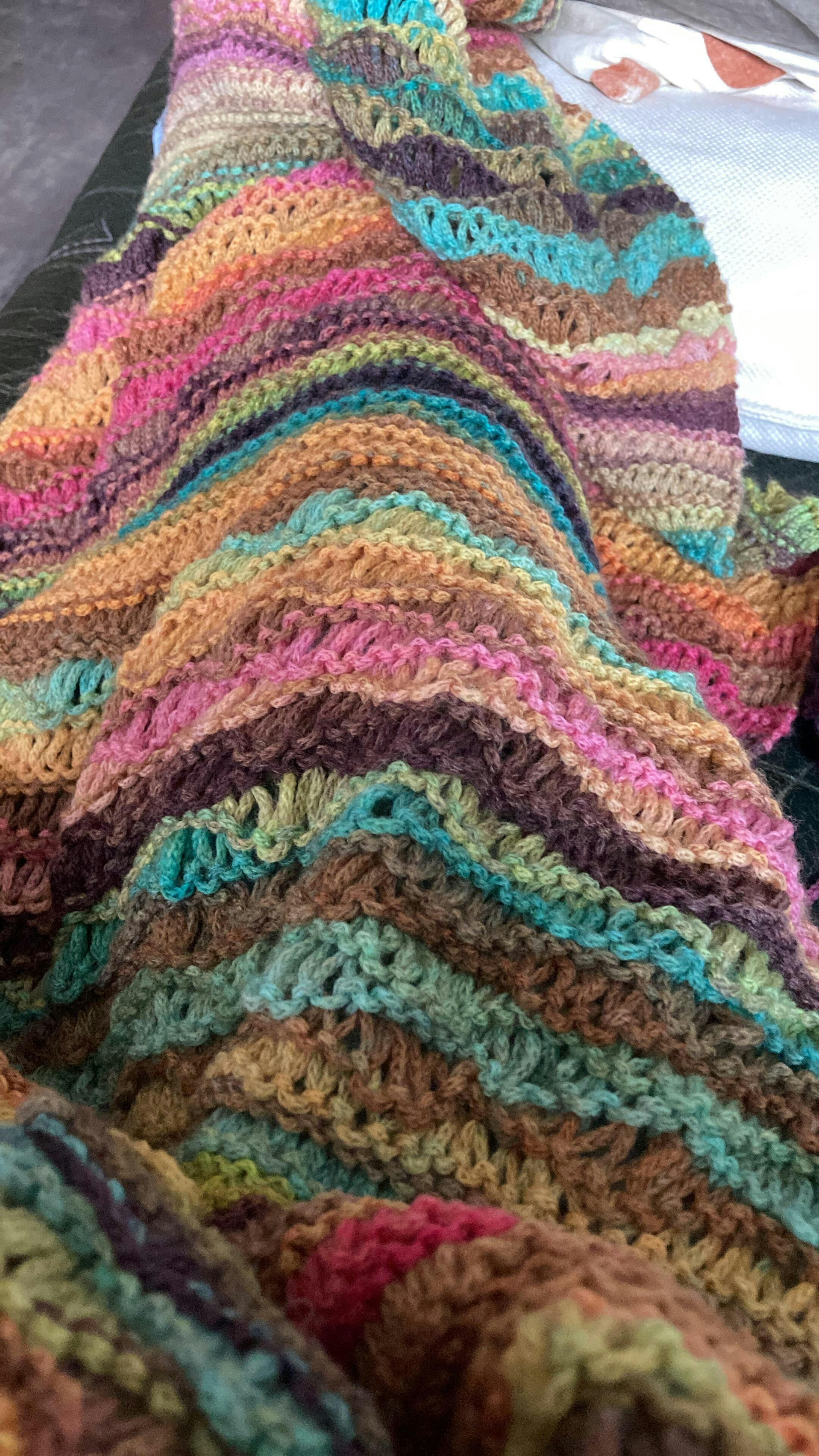 Bij deze sjaal in het patroon het golfpatroon laten vervallen, vond de halen te groot, dus uitgehaald.