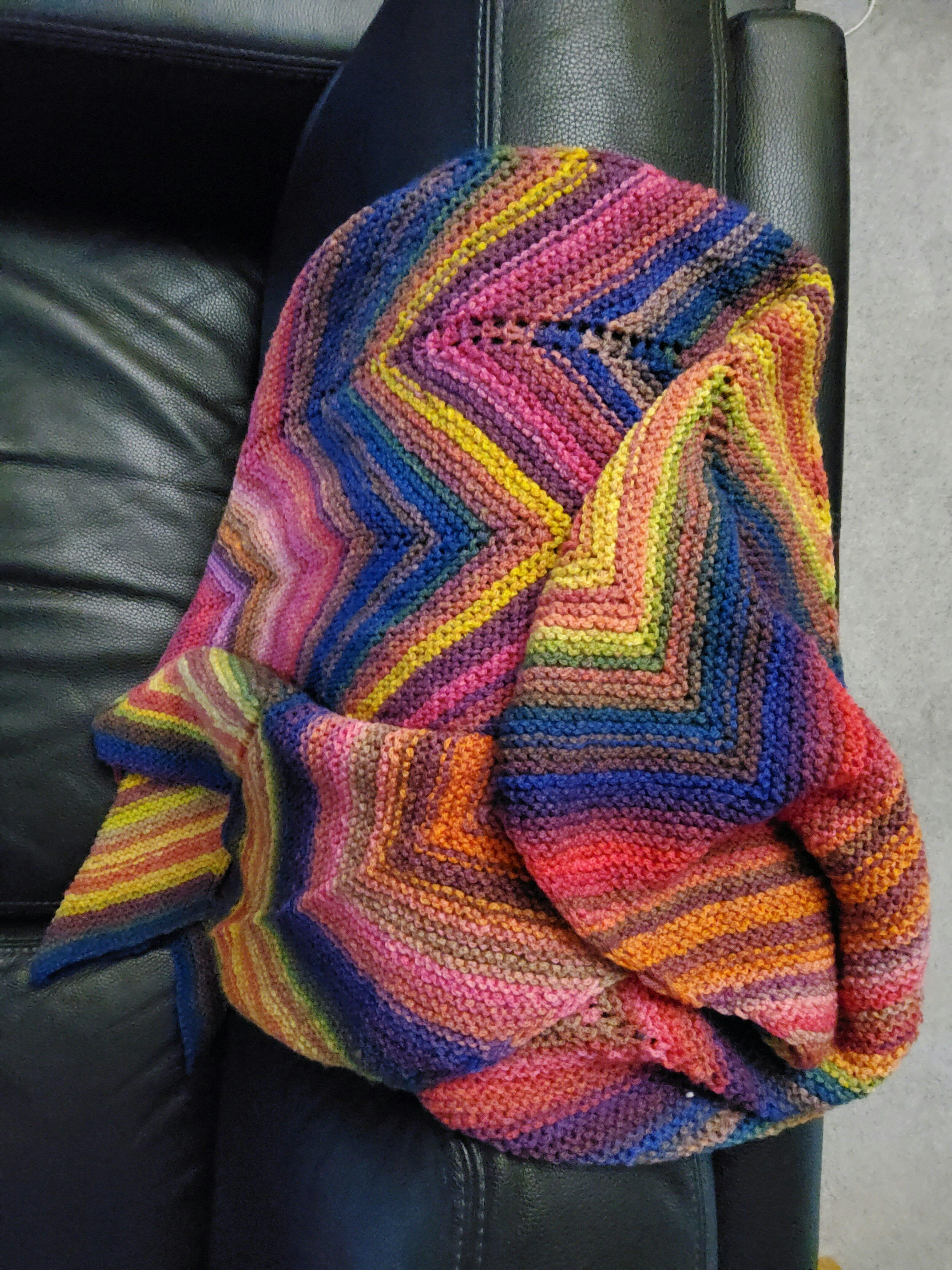 Deze sjaal brei je in een zigzagpatroon en blijft leuk om te maken dankzij de vele kleurwisselingen in het garen!