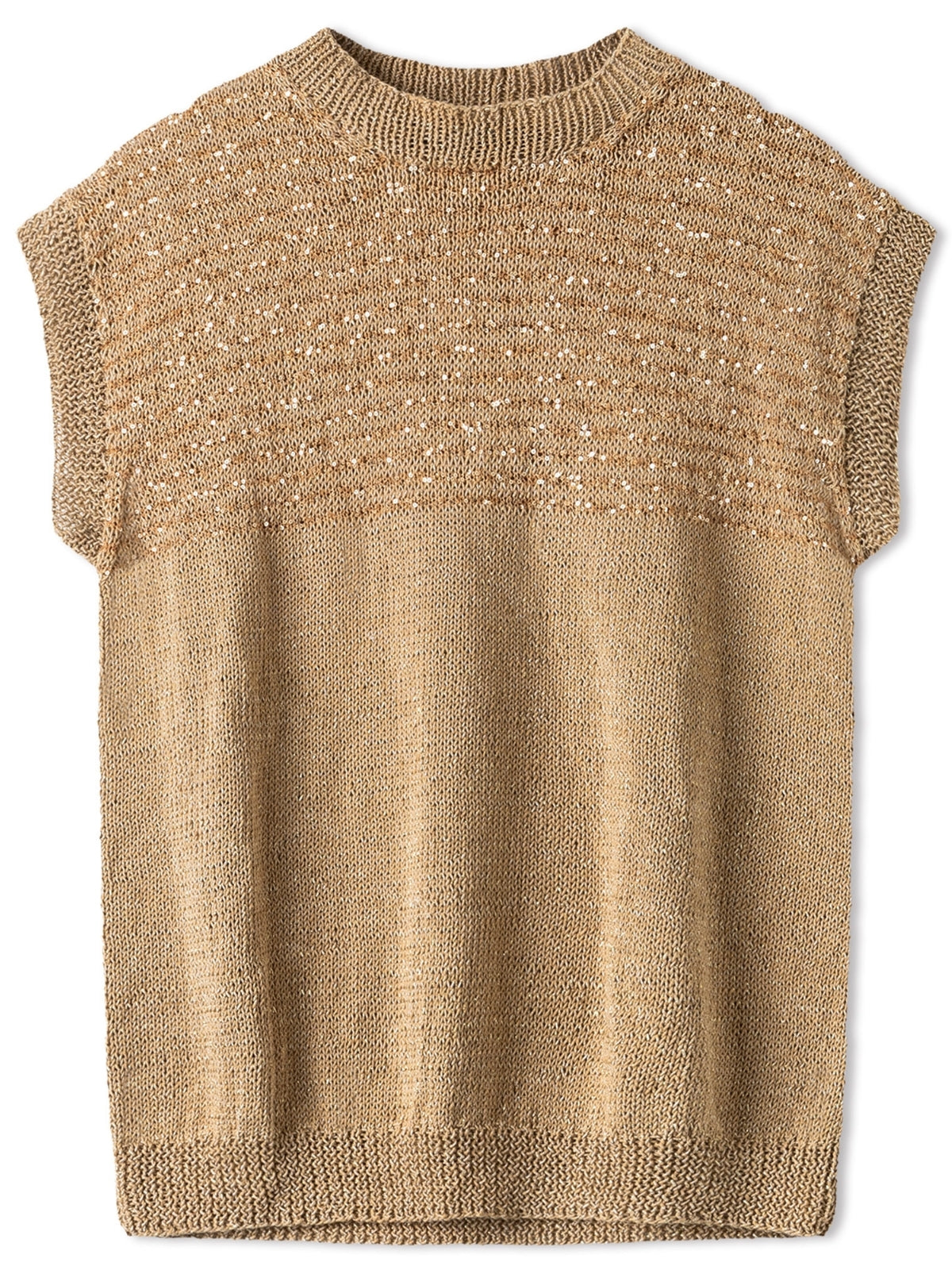 Deze top heeft een subtiel lurex glittertje en aan de bovenkant streepjes met kleine pailletten. De top wordt in panden gebreid, de boorden brei je eraan op korte rondbreinaalden.