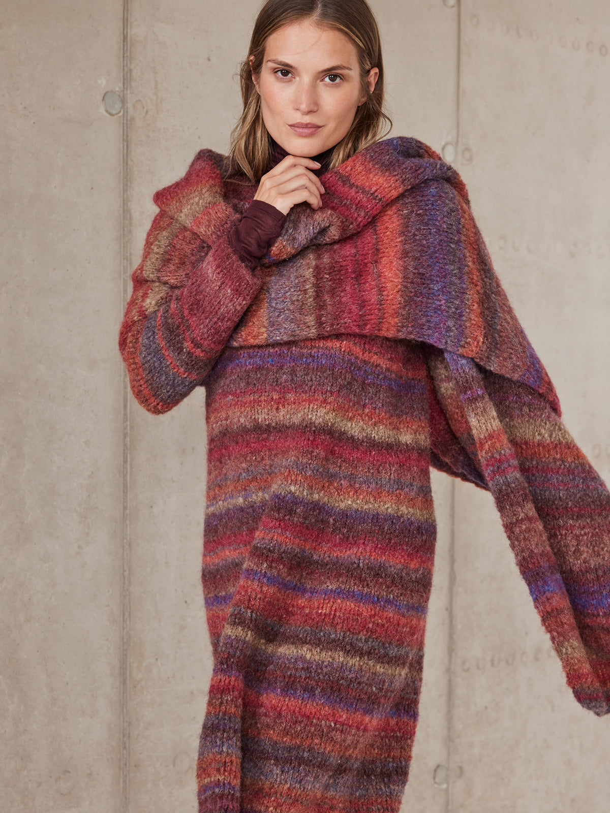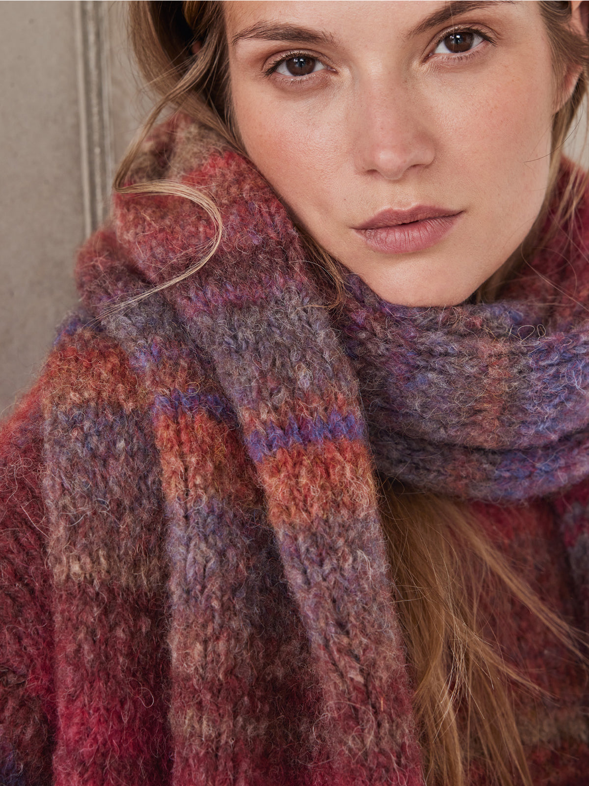 De sjaal wordt gebreid met Gigante Multi, dit garen bestaat uit 70% alpaca en 30% polyamide. De sjaal wordt ca. 45 x 220 cm.