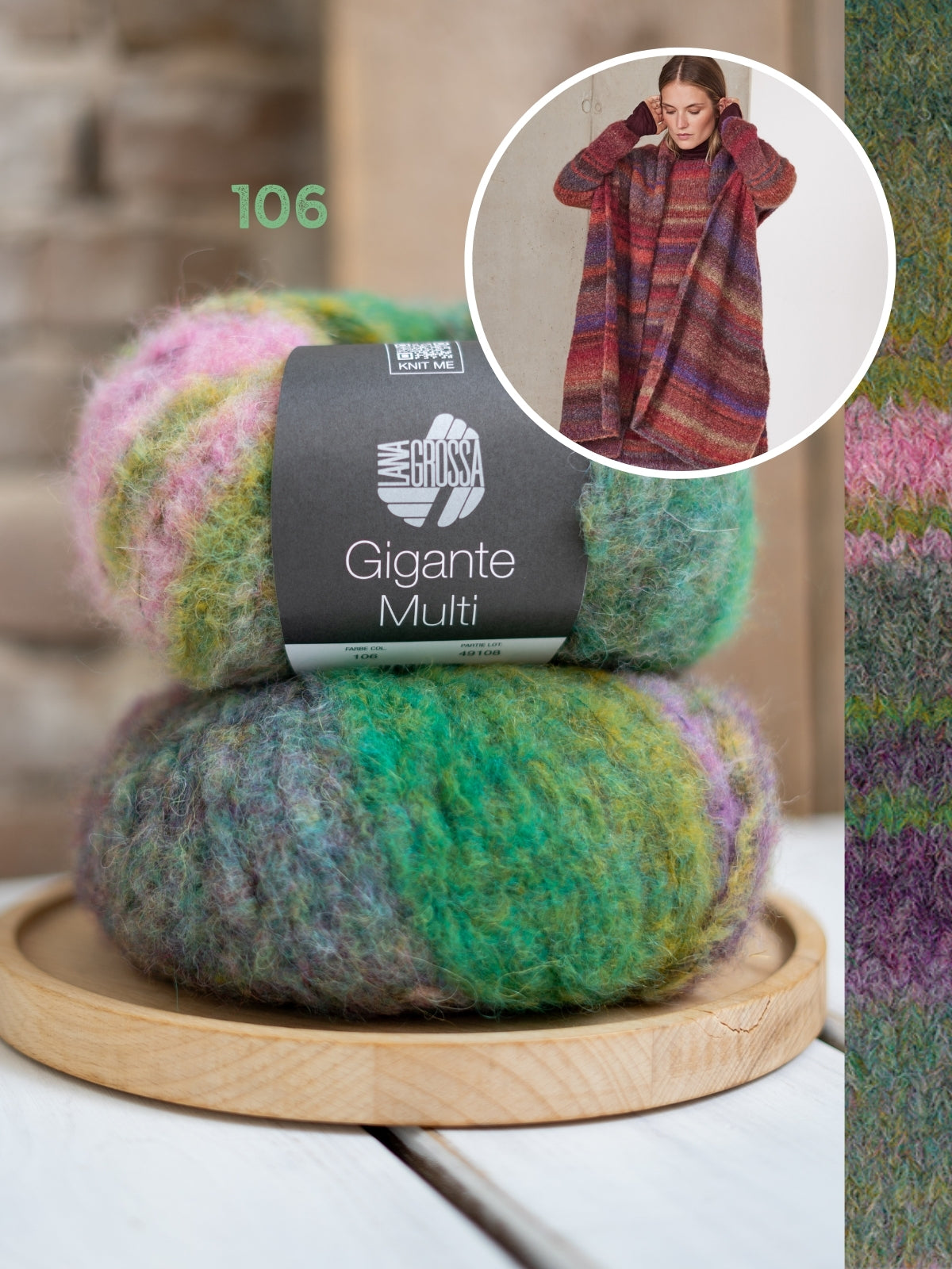 Het pakket bestaat uit 5 bollen Gigante Multi en het Filati Journal no. 70 magazine van Lana Grossa. De benodigde breinaalden (naaldpunten 5.5mm met draad 80cm) kun je hieronder toevoegen aan je winkelmandje.