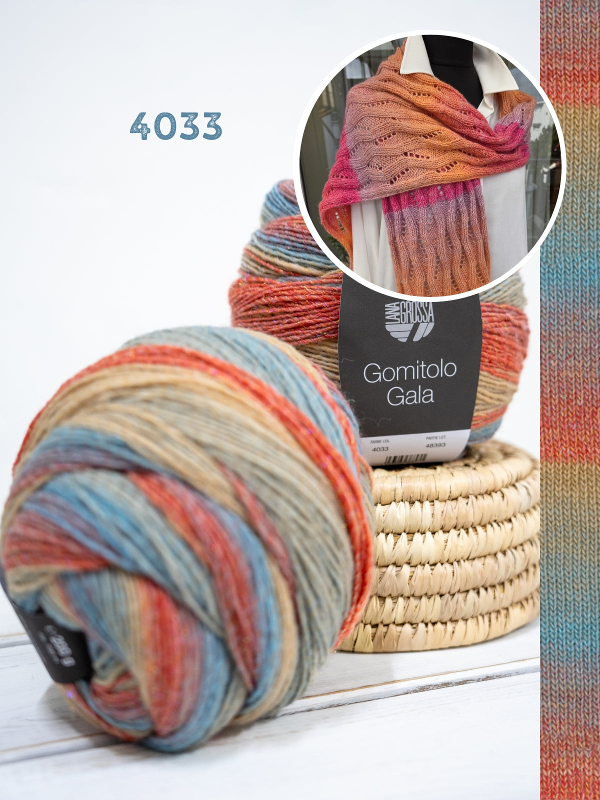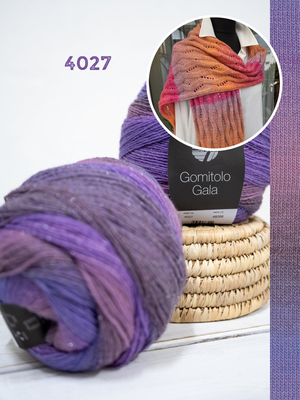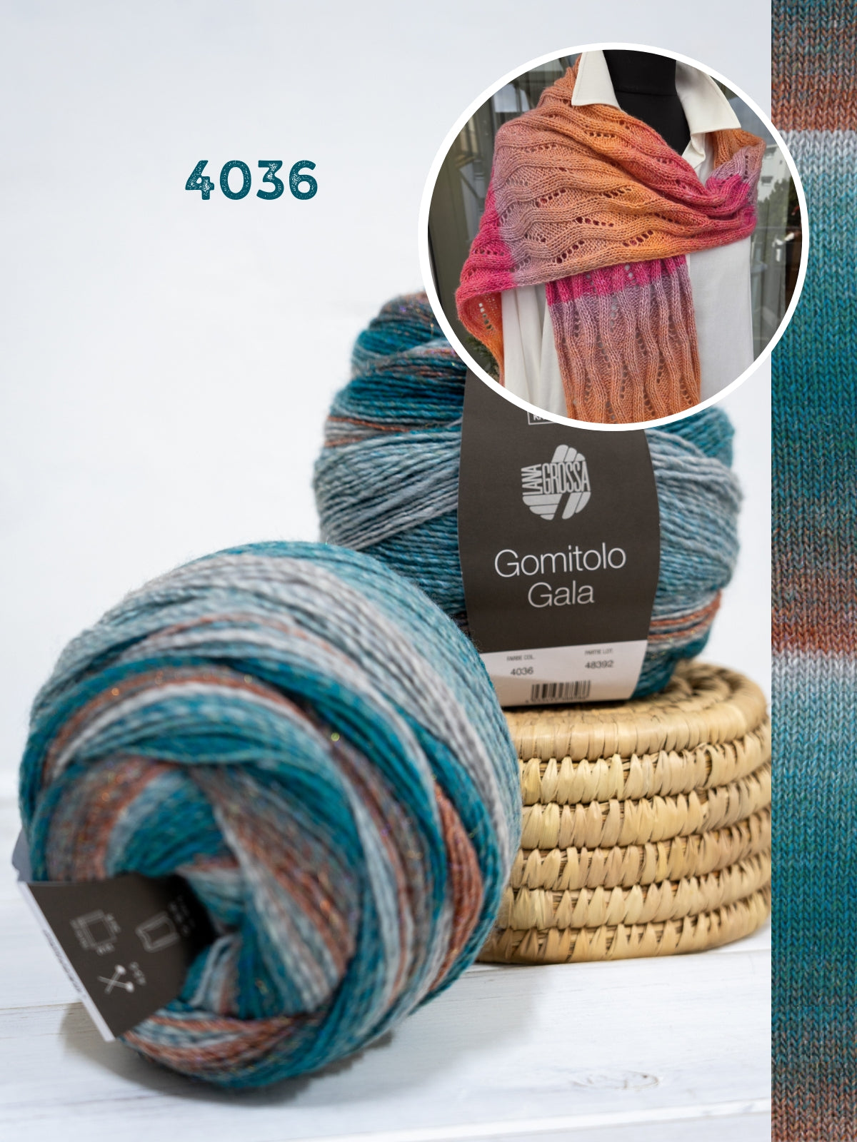 De sjaal wordt gebreid met Gomitolo Gala (60% wol, 38% acryl, 2% polyester). De sjaal wordt ca. 210 x 34 cm, gemeten na het opspannen.