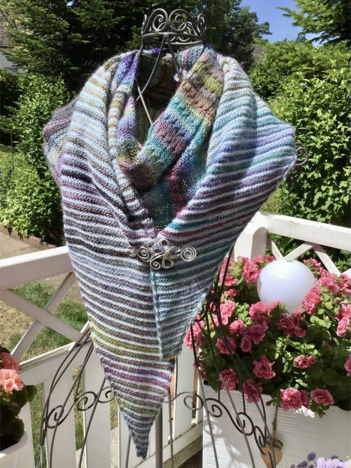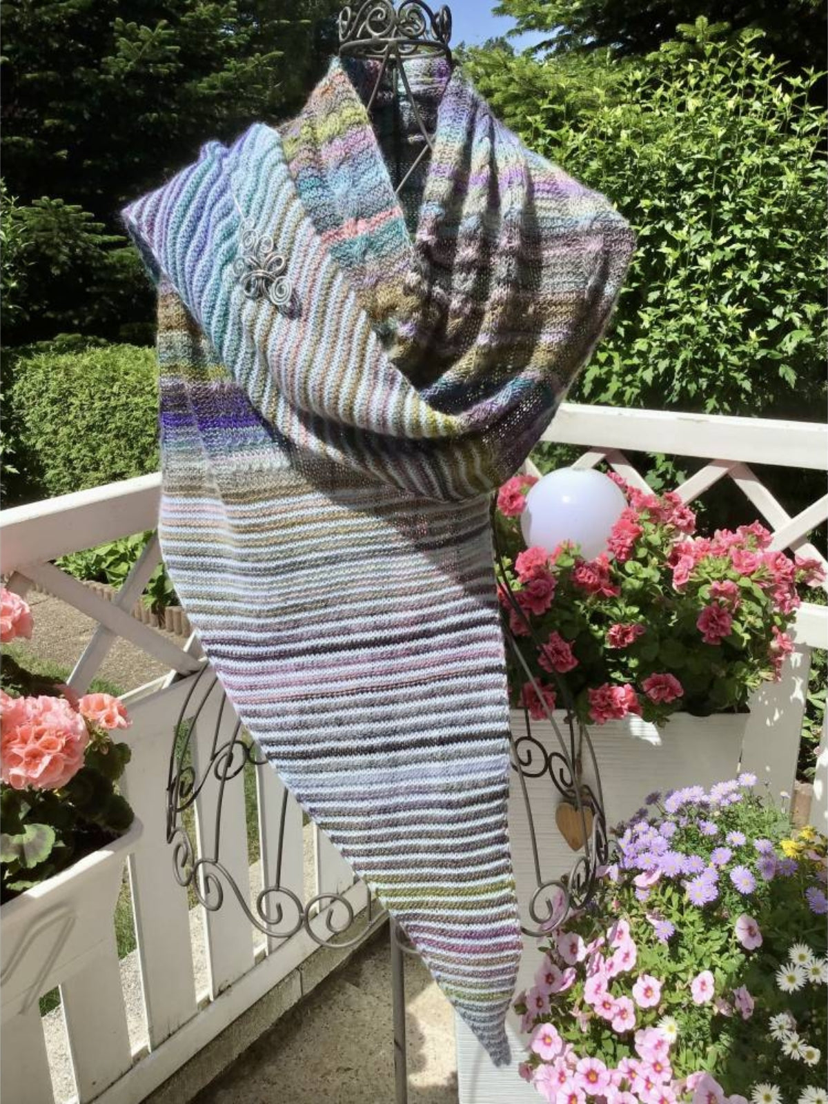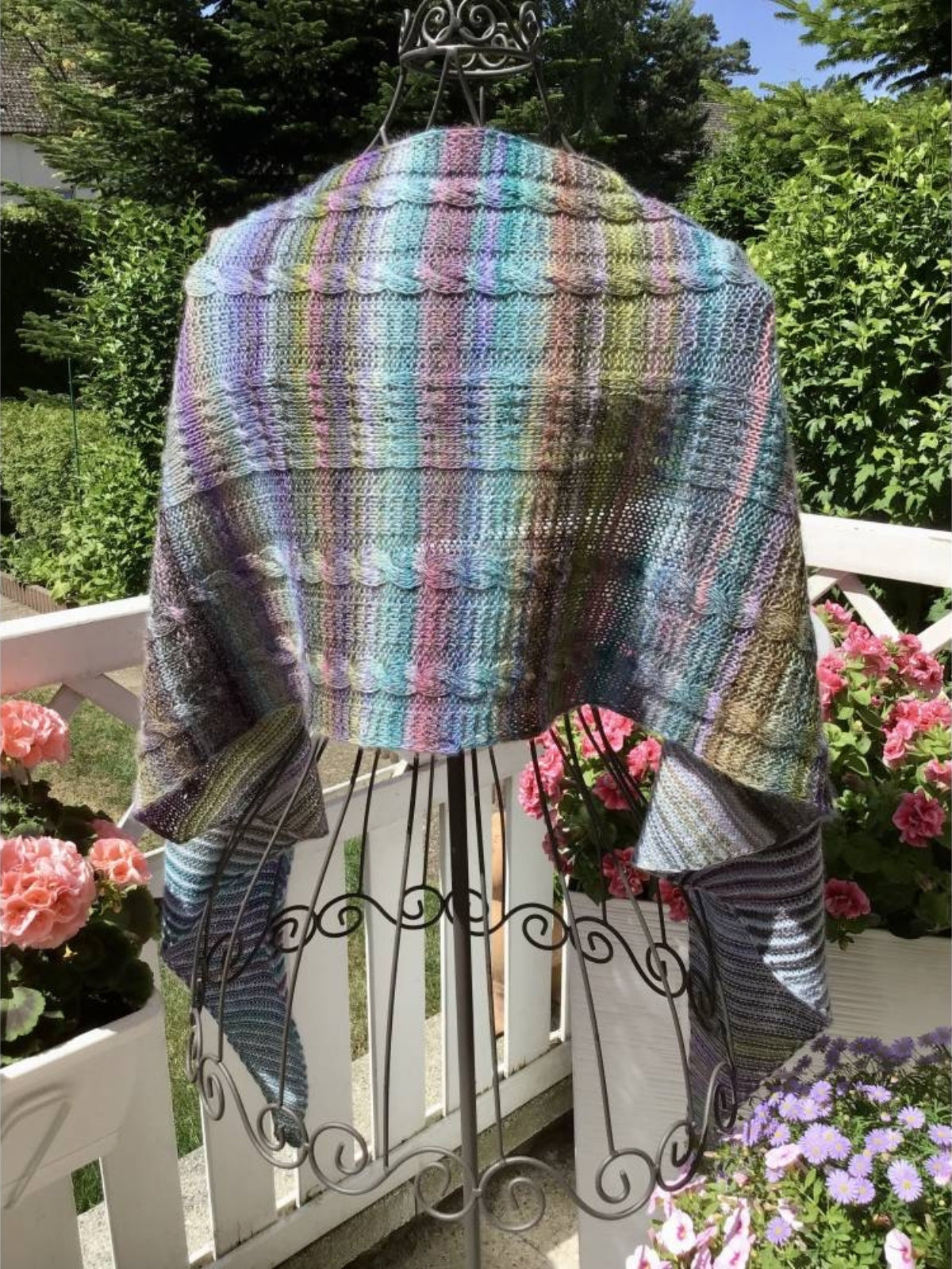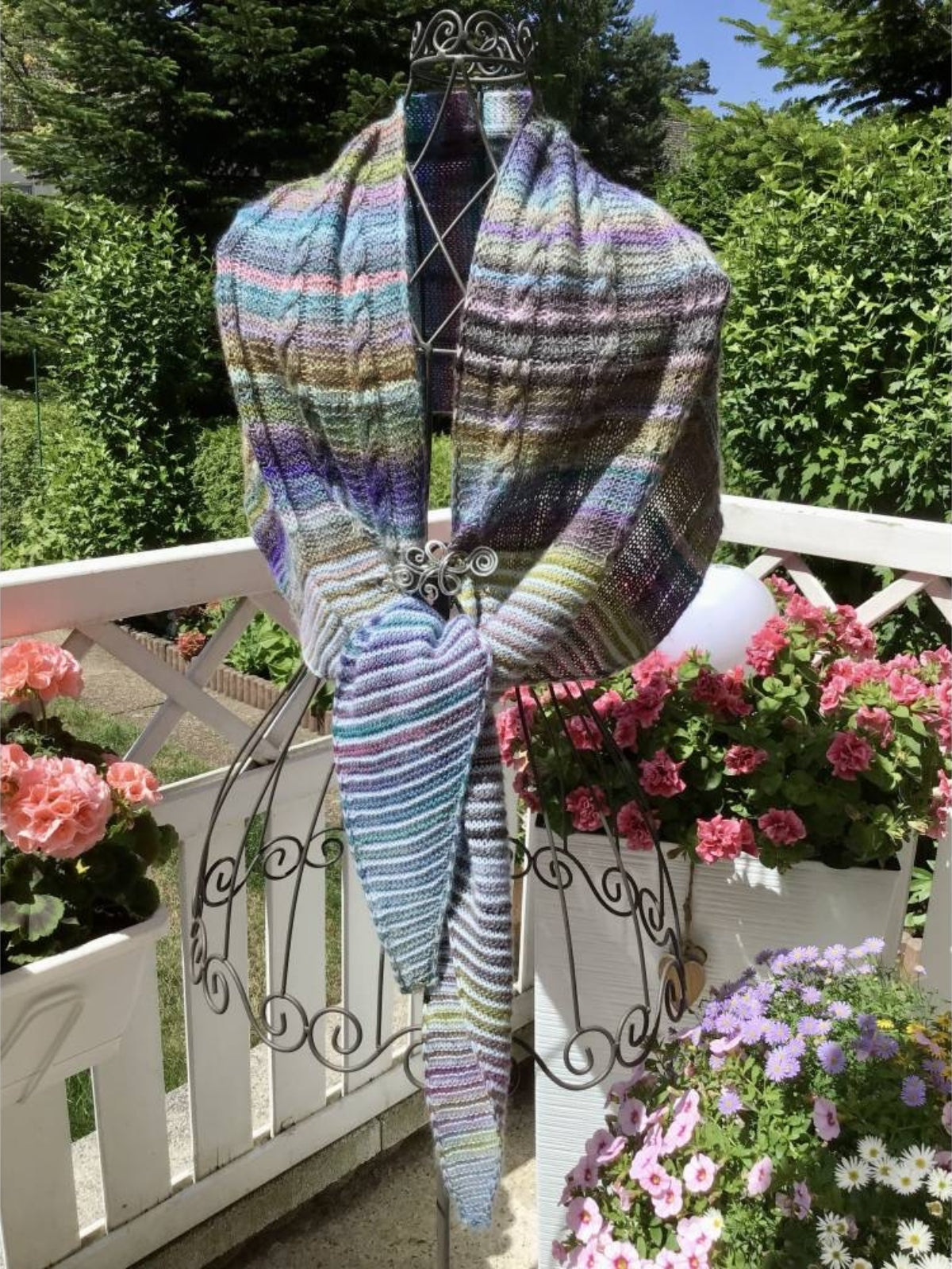 Een van Liza haar testerbreisters, Claudia, heeft deze prachtige variant gemaakt van de geliefde Orange Night stola. In deze stola brei je streepjes met twee verschillende garens en het middelste deel heeft verschillende kabels.
