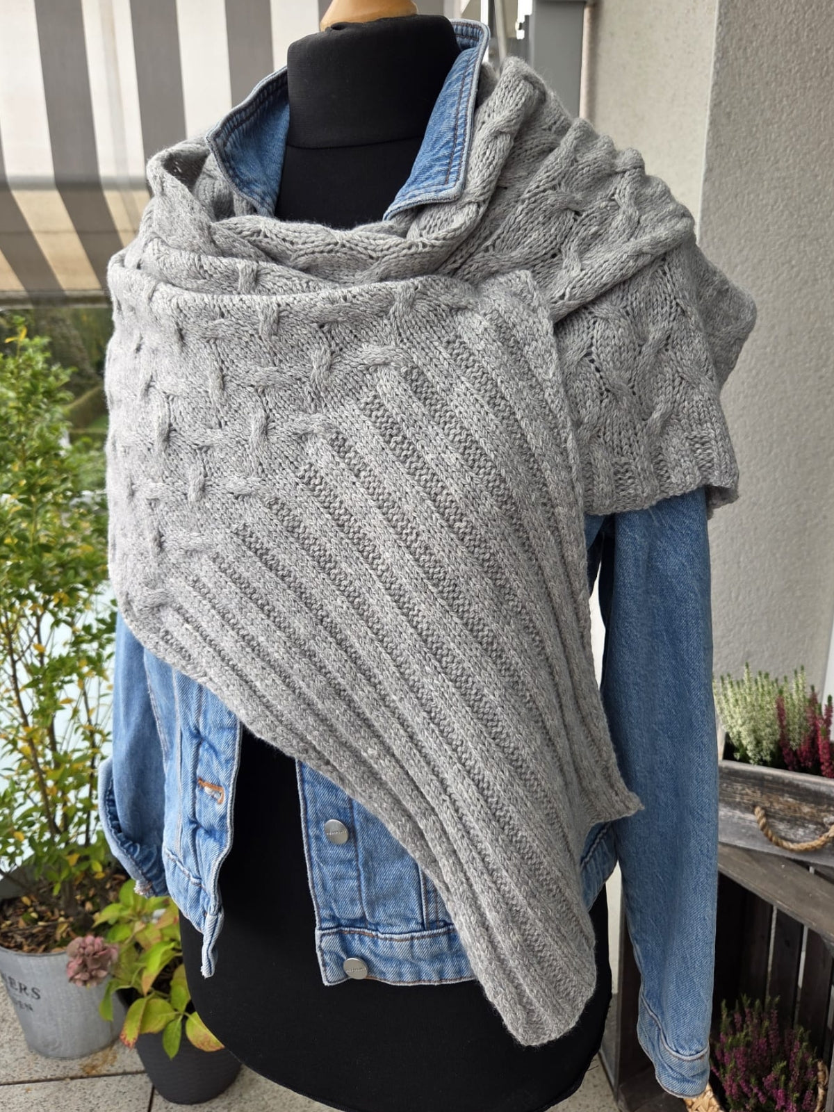 Deze sjaal heeft een prachtig kabelpatroon dat steeds herhaalt. Als je de smaak eenmaal te pakken hebt brei je al die kabels zo! De sjaal eindigt met een toelopende boord. Deze versie in Cool Merino is gebreid door tester Maria.