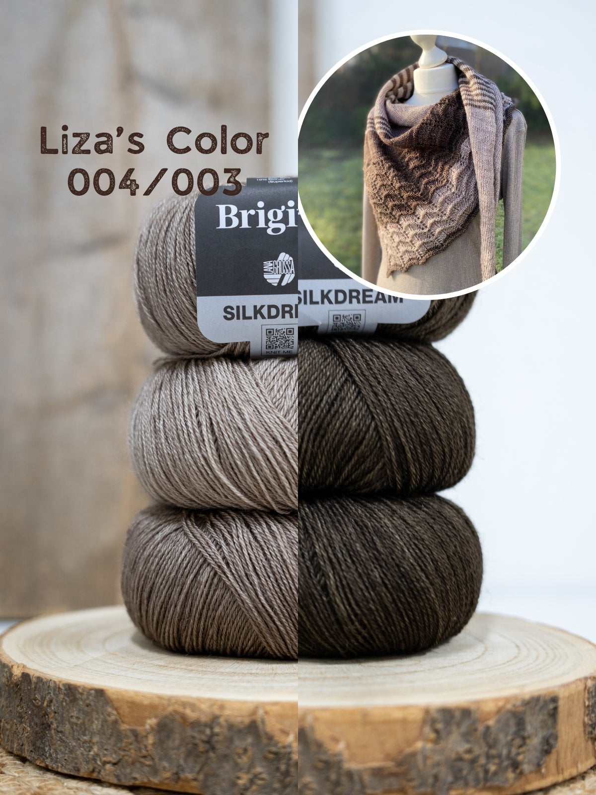 De stola wordt gebreid met Silkdream, dit garen bestaat uit 60% merinowol, 30% zijde en 10% superkid mohair. De stola wordt ca. 182 x 78 cm, gemeten na het opspannen.