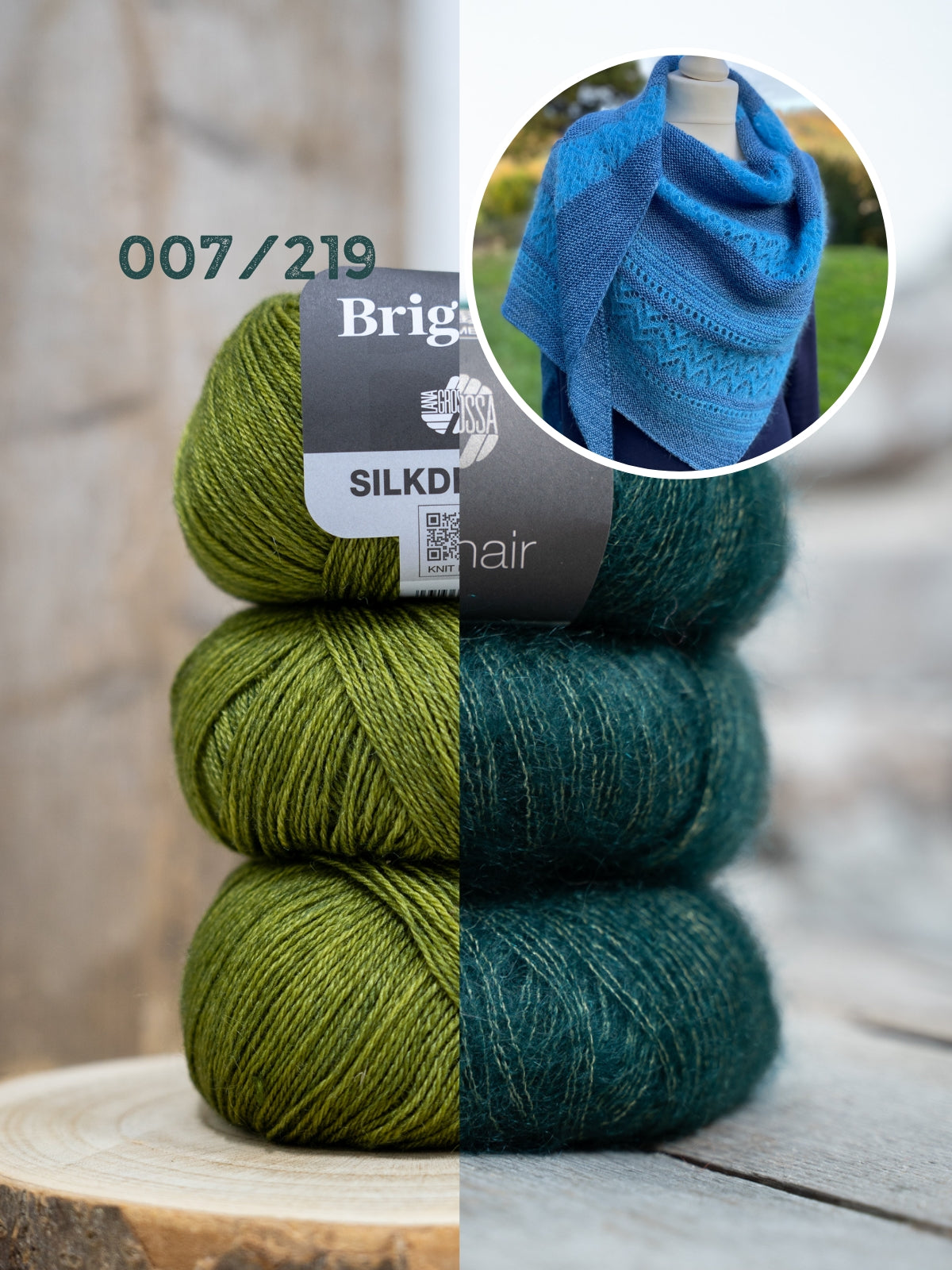 De stola wordt gebreid met Silkdream ( 60% merinowol, 30% zijde en 10% superkid mohair) en Silkhair (70% superkid mohair, 20% zijde). De stola wordt ca. 214 x 65 cm, gemeten na het opspannen.