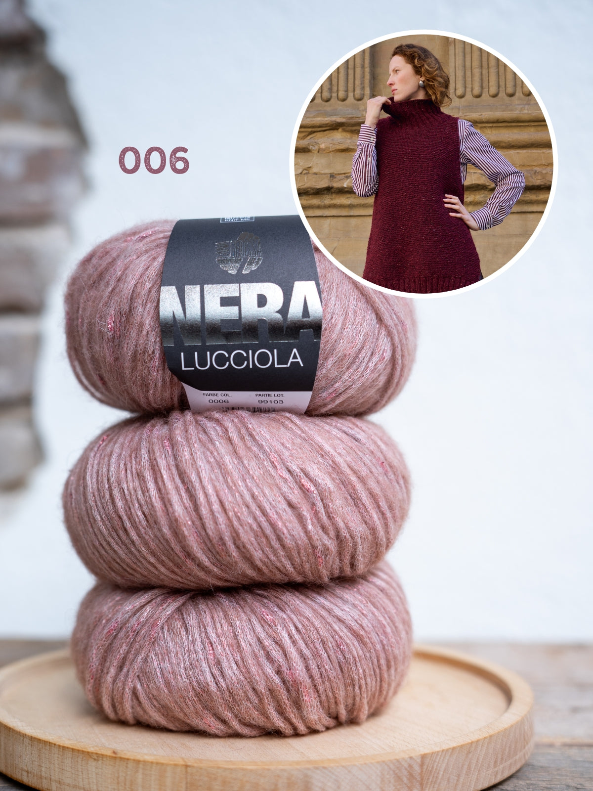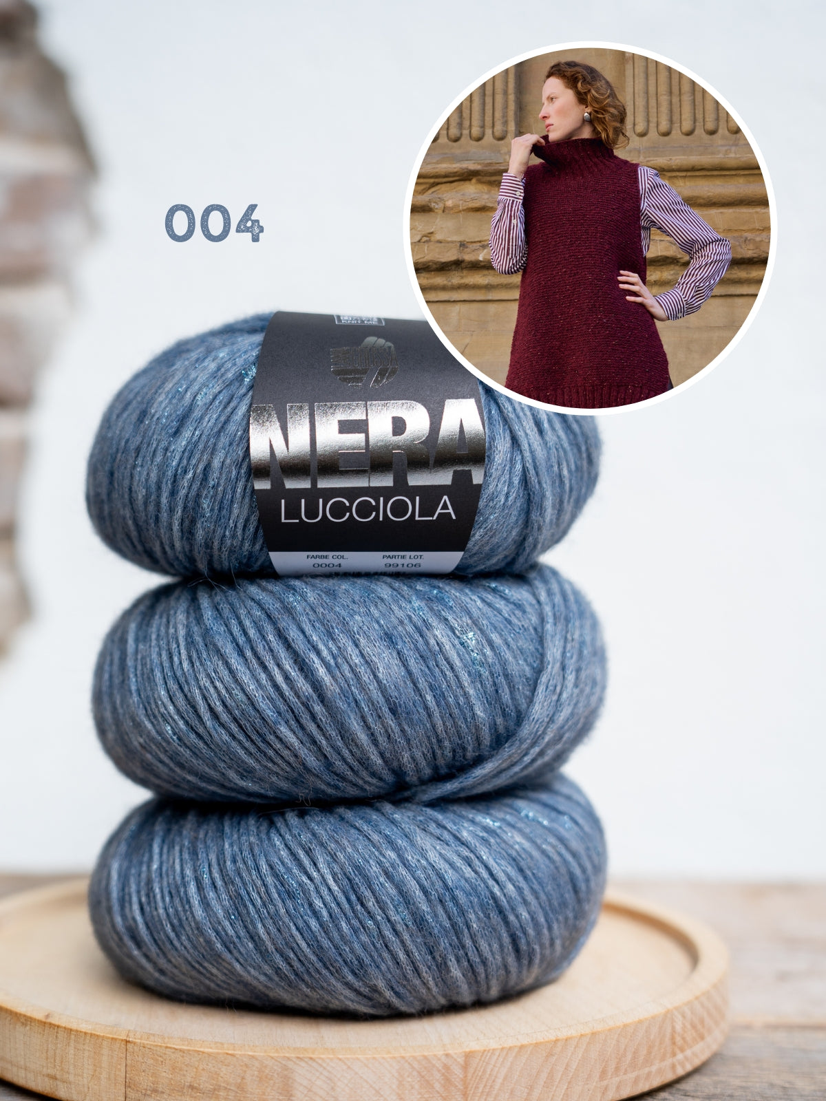 Het pakket bestaat uit 7/8/9/10 bollen Lucciola en het Nera 1 magazine van Lana Grossa. De benodigde breinaalden (4mm, 4.5mm, korte naaldpnten 4mm met draad 40cm) kun je hieronder toevoegen aan je winkelmandje.
