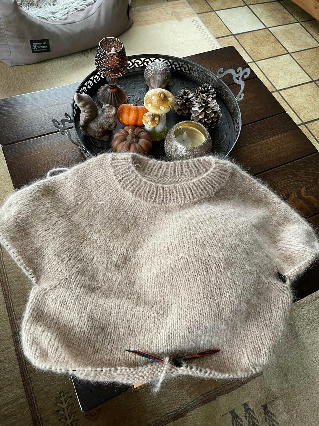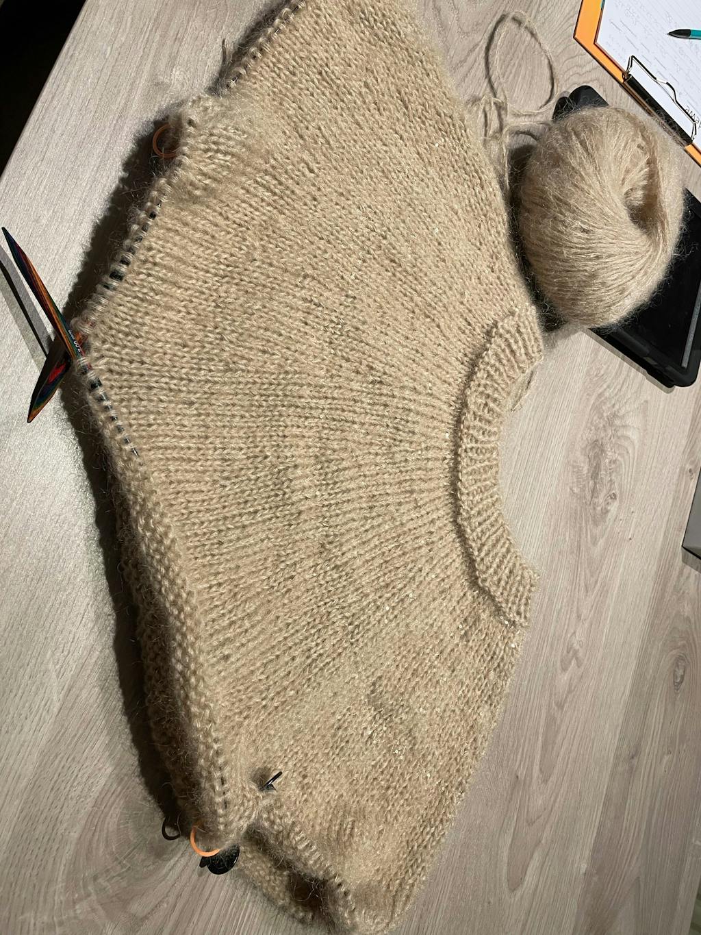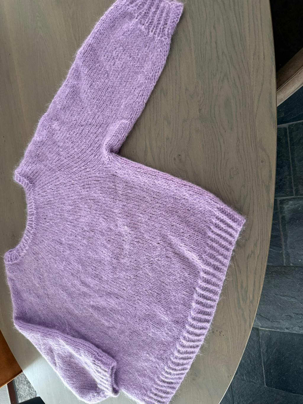 De trui wordt gebreid met Mohair Di Gio (55% superkid mohair, 45% merinowol) en Glamour (55% acryl, 45% polyester). Het patroon is uitgeschreven in maat 36 t/m 46.