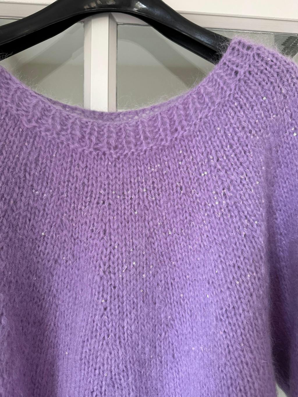 Dit is een fijne basic voor in je kledingkast, extra leuk gemaakt omdat je bij een aantal rijen in de pas een draadje erbij houdt met kleine pailletten! De trui wordt naadloos van boven naar beneden gebreid.