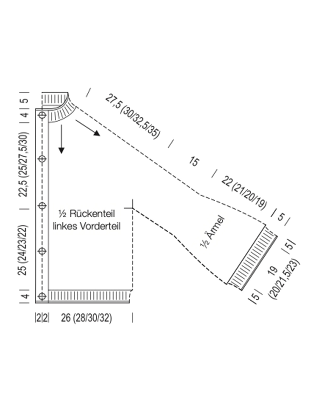 Dit vest is een simpel model dat wijd uitlopende mouwen heeft. Het vest wordt naadloos van boven naar beneden gebreid op rondbreinaalden.