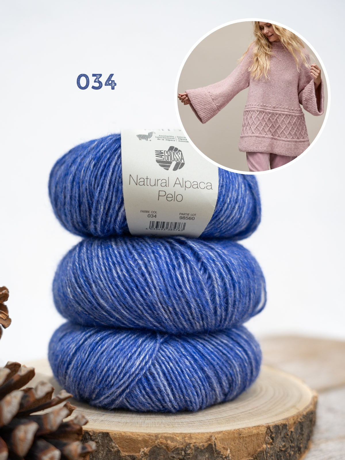 Het pakket bestaat uit 12 bollen Natural Alpaca Pelo en het Nordic Knits 4 magazine van Lana Grossa. De benodigde breinaalden (naaldpunten 4mm en 5mm met draad 60cm, 80cm of 100cm, voor de mouwen korte naaldpunten 4mm en 5mm met draad 40cm of sokkenbreinaalden 4mm en 5mm, een kabelnaald en eventueel steekmarkeerders) kun je hieronder toevoegen aan je winkelmandje.