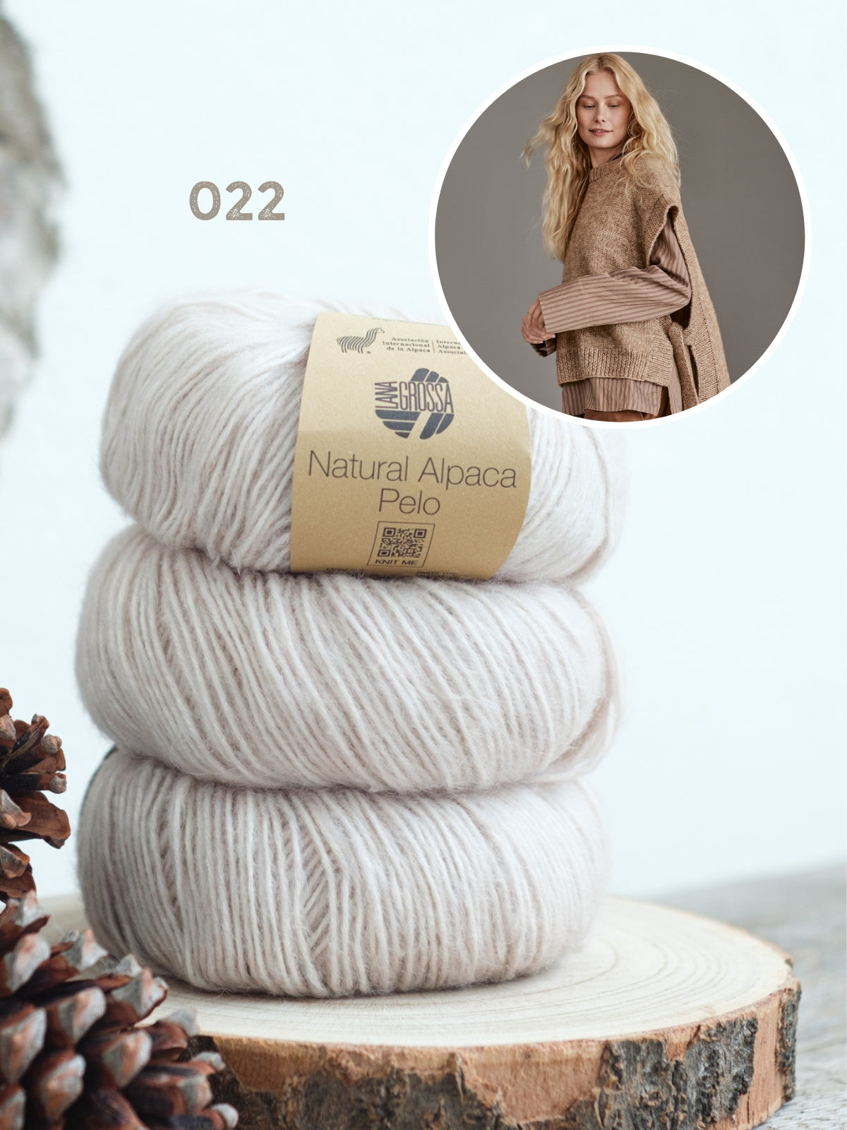 De slipover wordt gebreid met Natural Alpaca Pelo, dit garen bestaat uit 63% katoen, 31% baby alpaca en 6% merinowol. Het patroon is uitgeschreven in maat 36 t/m 50.