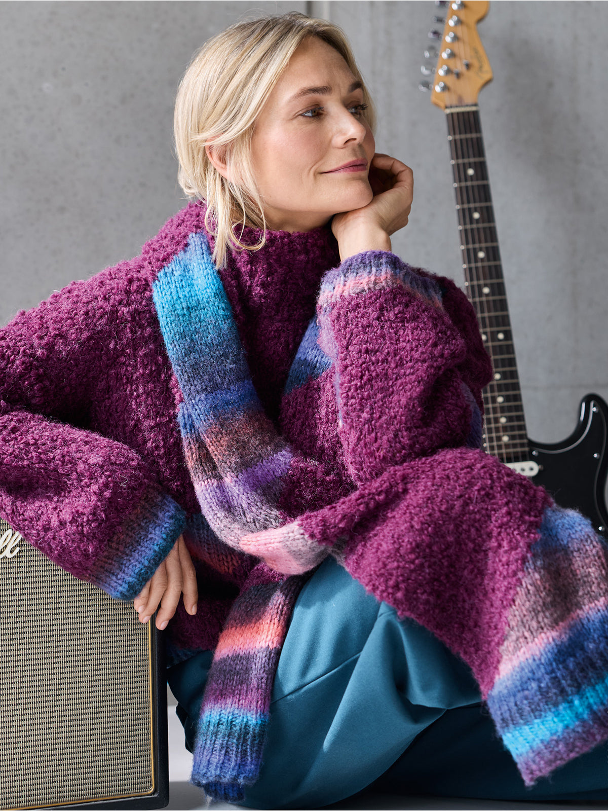 Deze heerlijk knusse sjaal brei je met een bouclé draadje. Met de intarsia techniek maak je er een diagonale baan in met een verloopgaren.