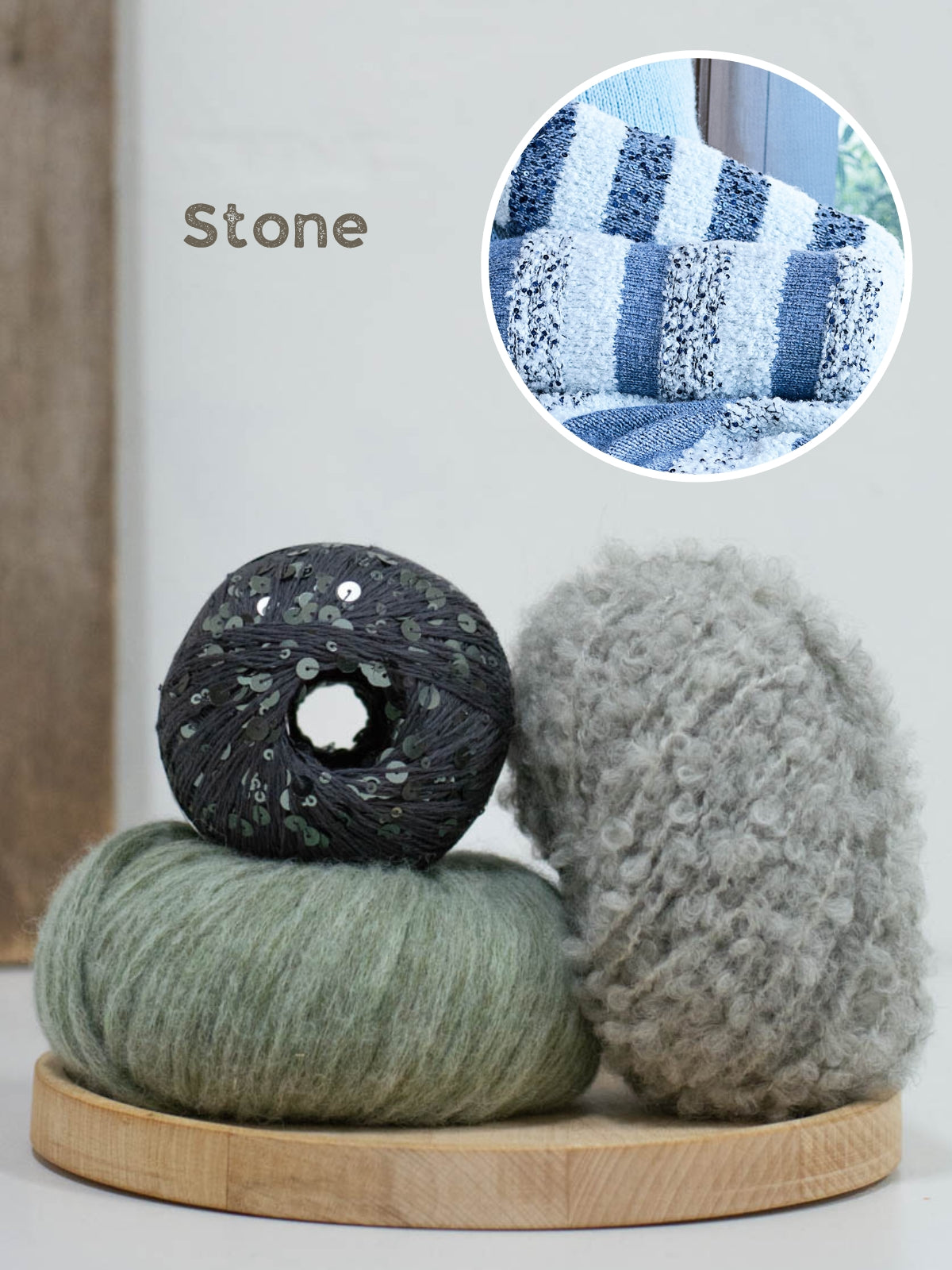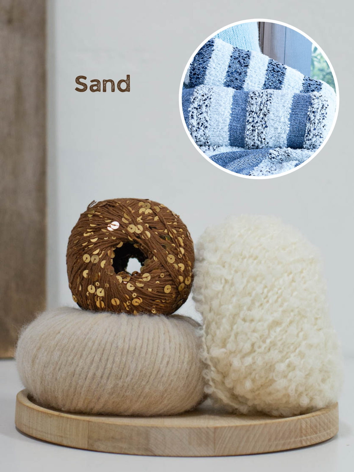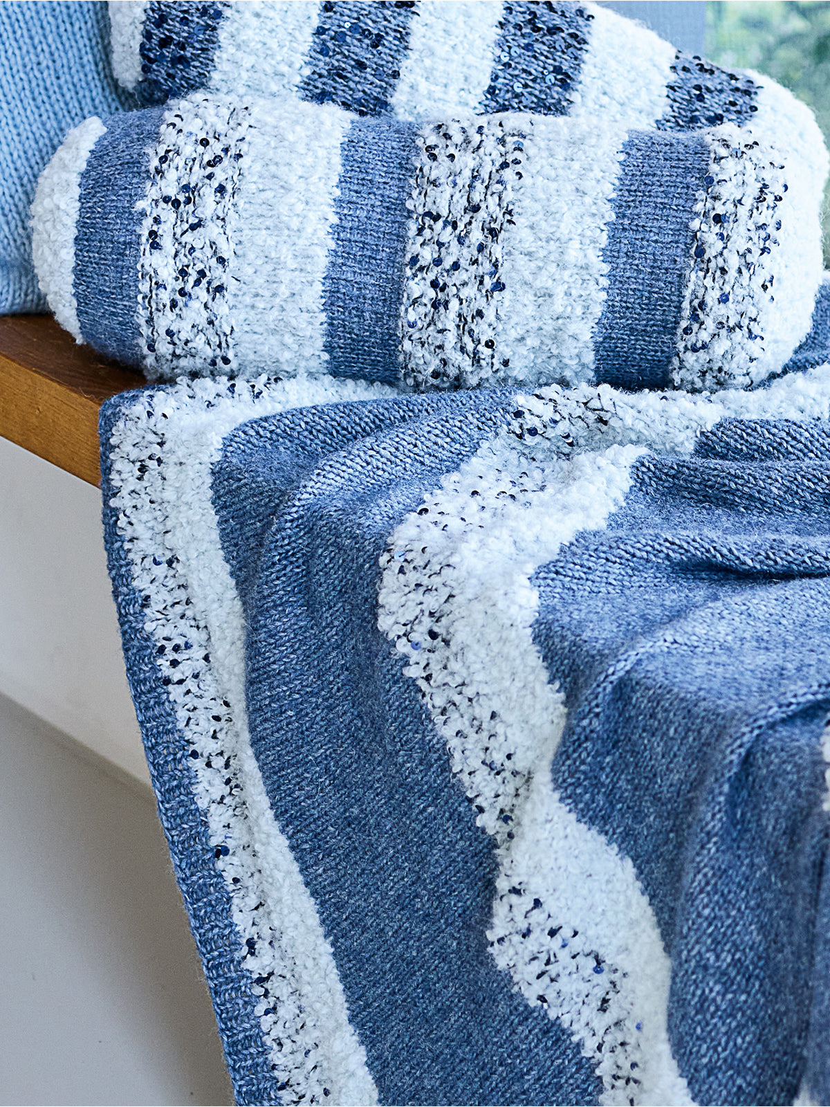 Het kussen wordt gebreid met Orsetto (60% merinowol, 40% alpaca), Brigitte no. 2 (47% baby alpaca, 45% katoen en 8% merinowol) en Cosmo (100% katoen + pailletten). Het kussen heeft een omvang van ca. 48 cm, wordt 37-40 cm lang en heeft een diameter van 14 cm.