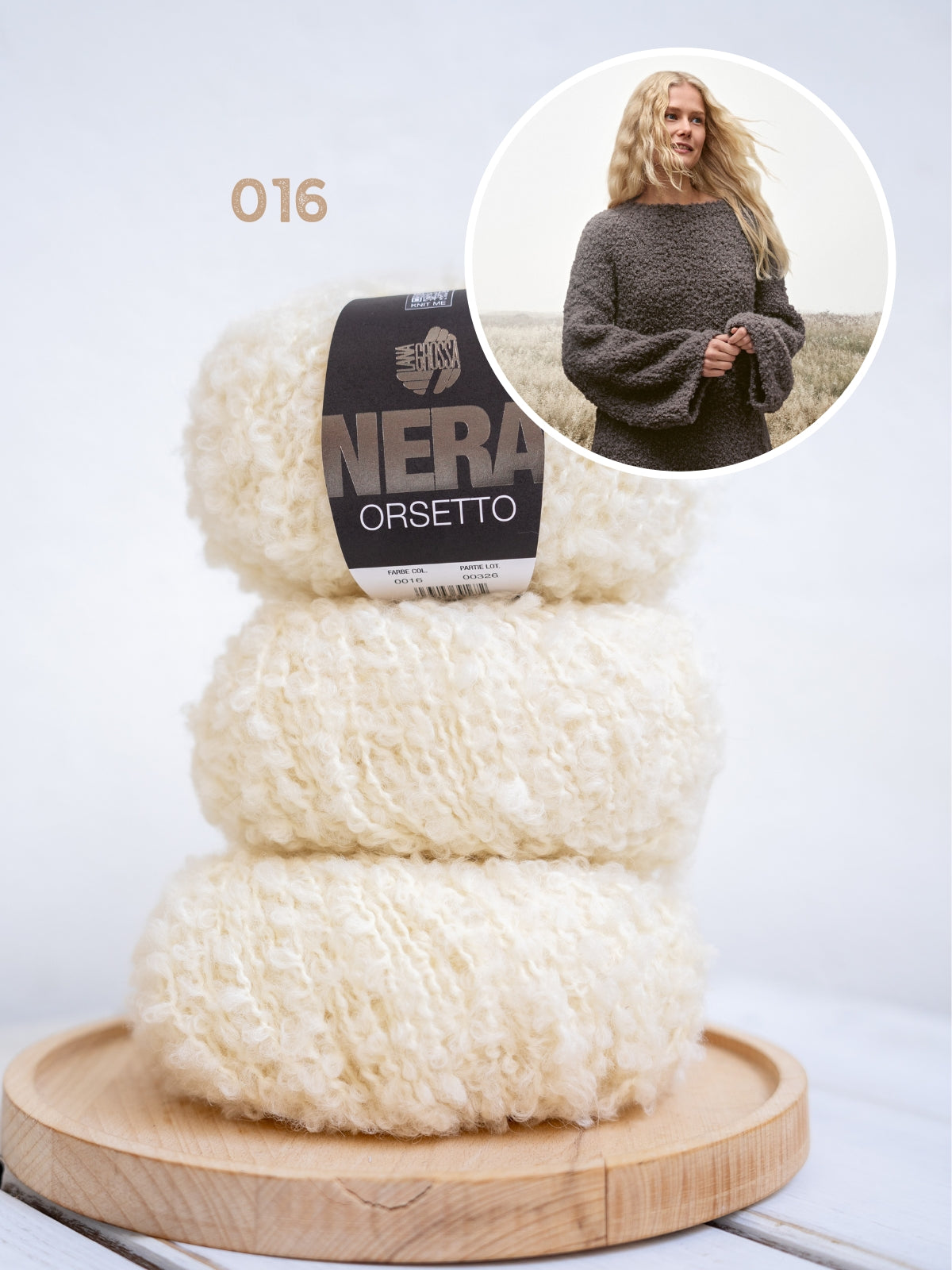 De trui wordt gebreid met Orsetto, dit garen bestaat uit 60% merinowol, 40% superfijn alpaca. Het patroon is uitgeschreven in maat 36 t/m 50.