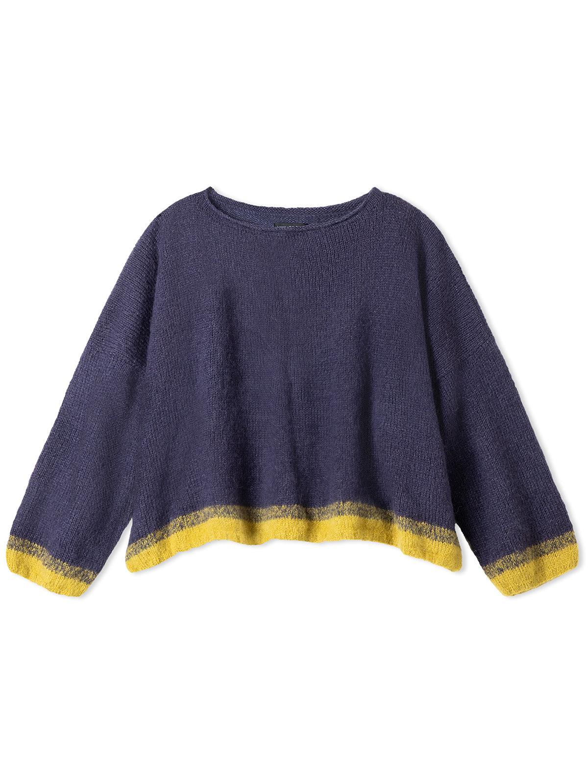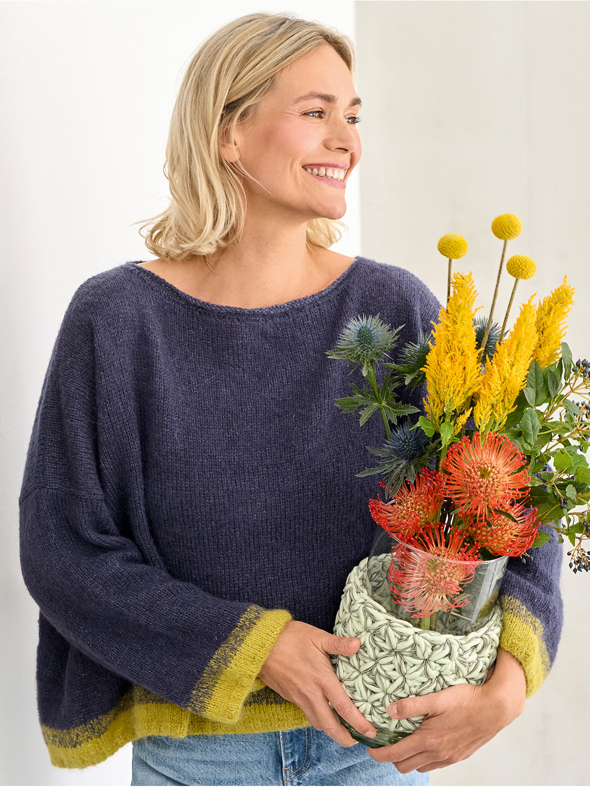 Deze trui is heerlijk warm, omdat je een pluizig draadje dubbel houd. Aan de onderkant van het lijf en de mouwen wissel je steeds 1 draad van kleur, wat voor een mooi verloop zorgt. De trui wordt in panden gebreid, tot slot brei je de hals er op rondbreinaalden aan vast.