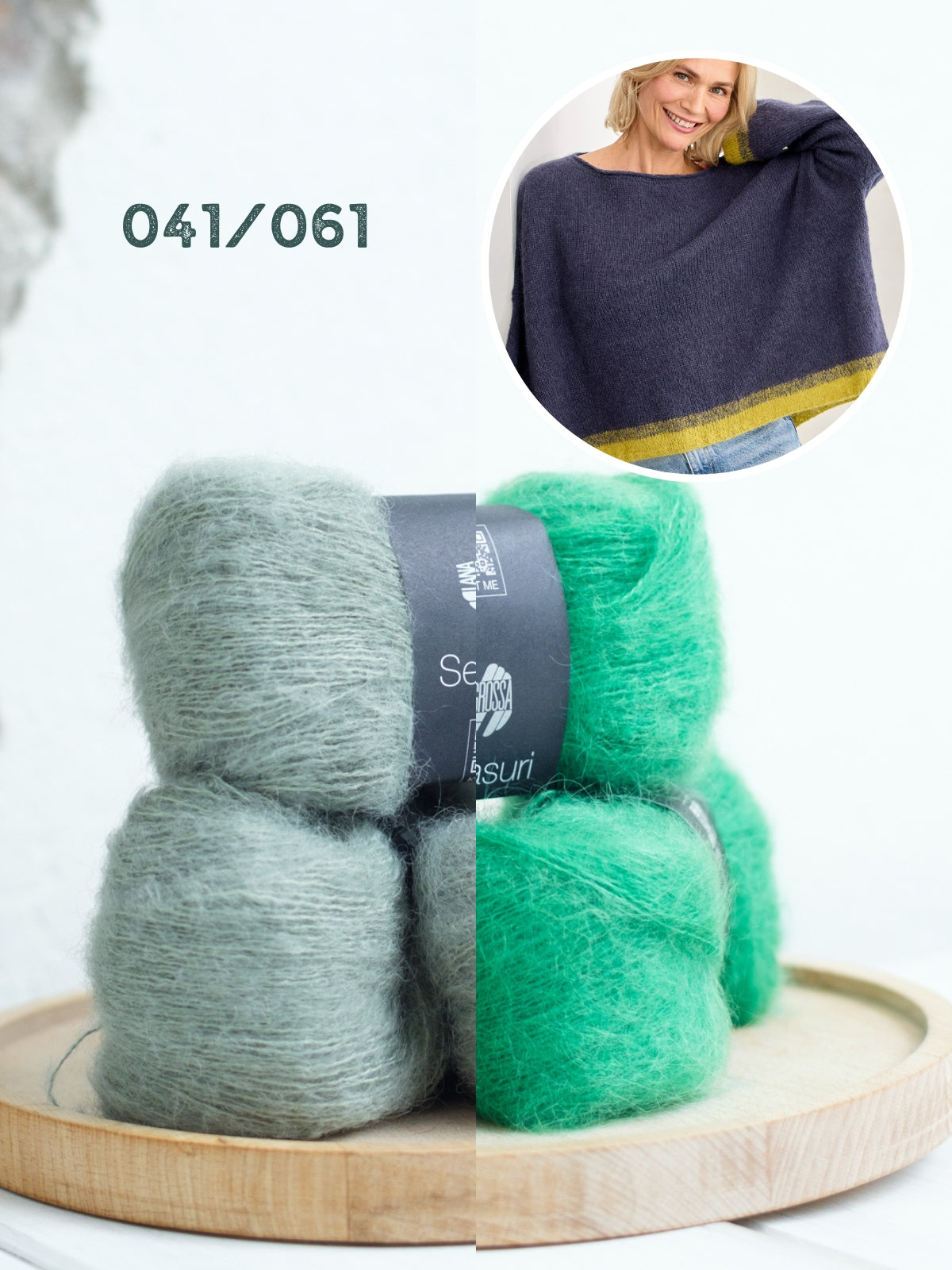 De trui wordt gebreid met Setasuri, dit garen bestaat uit 69% suri alpaca en 31% zijde. Het patroon is uitgeschreven in maat 36 t/m 50.