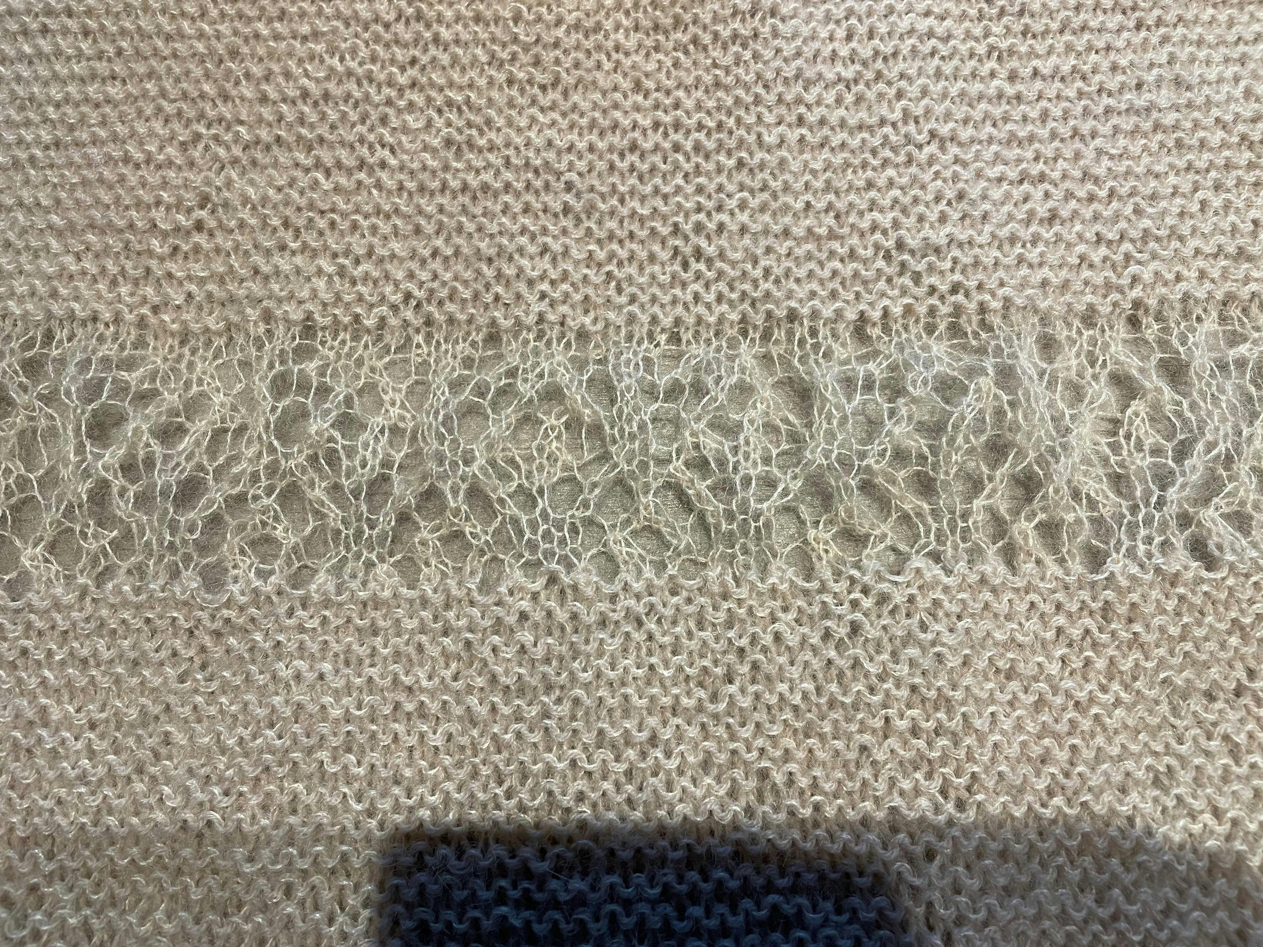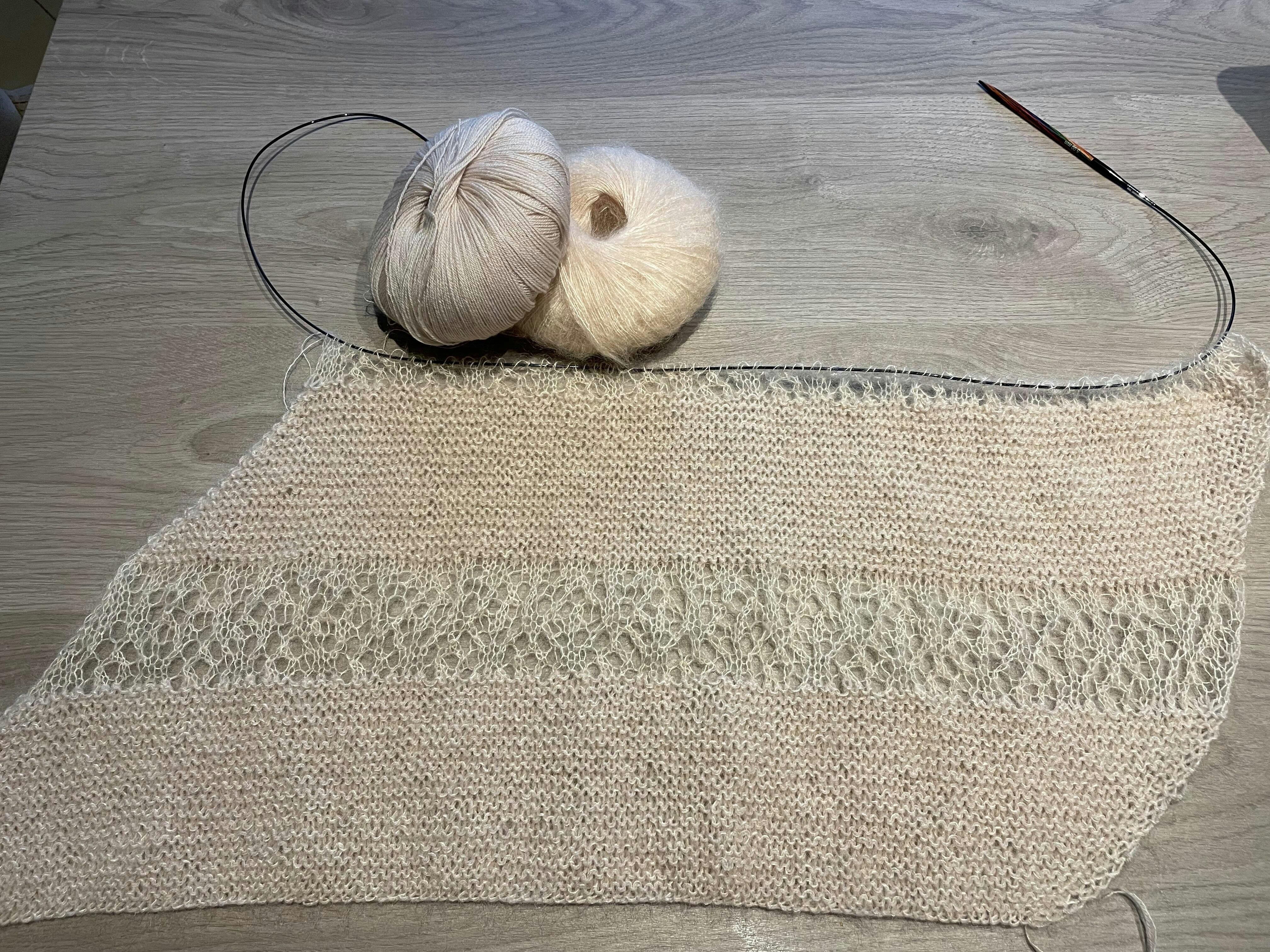 De stola wordt gebreid met Cool Wool Lace (100% merinowol) en Silkhair (70% kidsilk mohair, 30% zijde). De sjaal wordt ca. 190 cm lang en 30 cm breed.