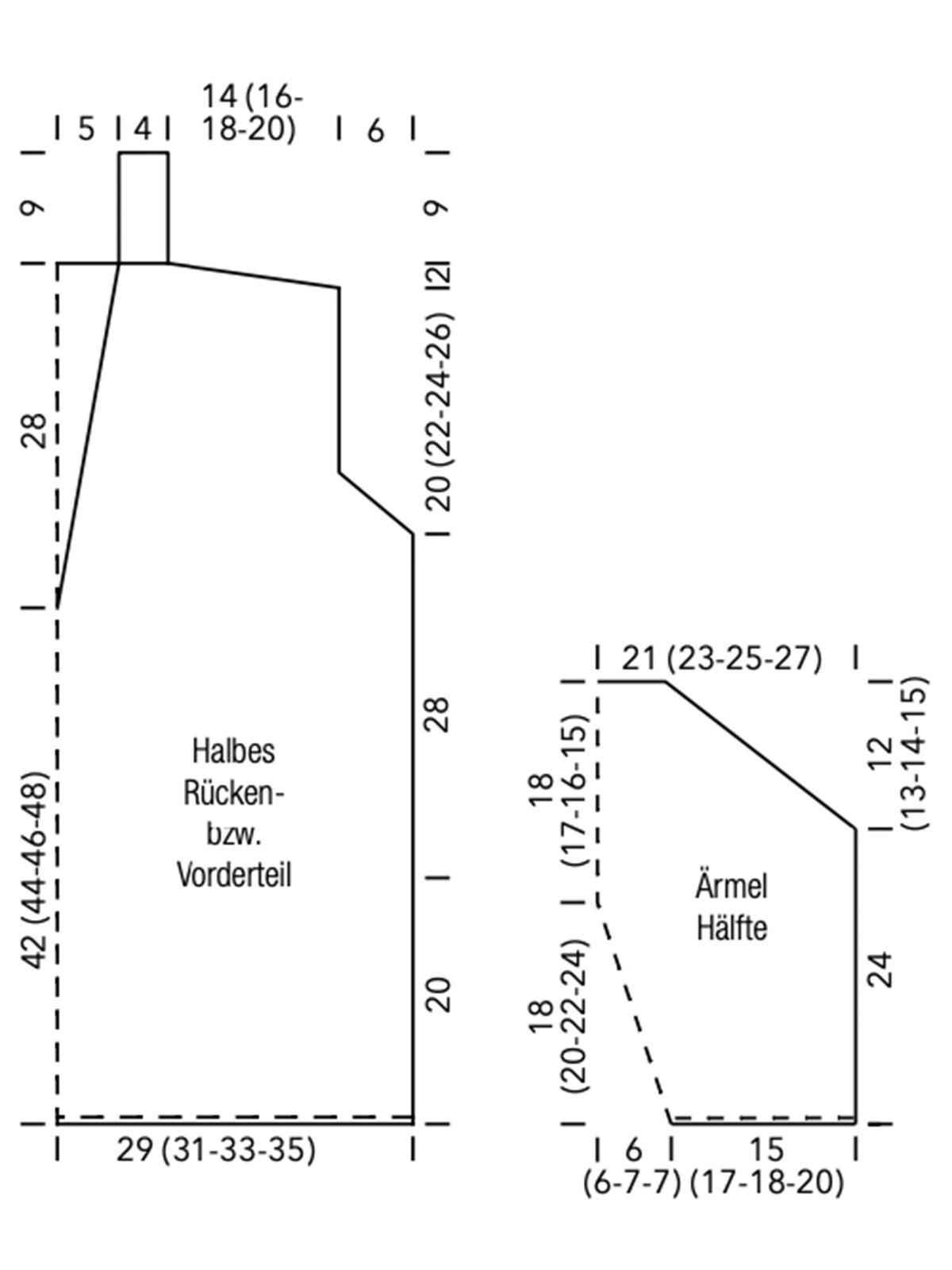 Dit tuniek heeft een diepe v-hals en een split aan de zijkanten. Het wordt in panden gebreid en tot slot aan elkaar genaaid.