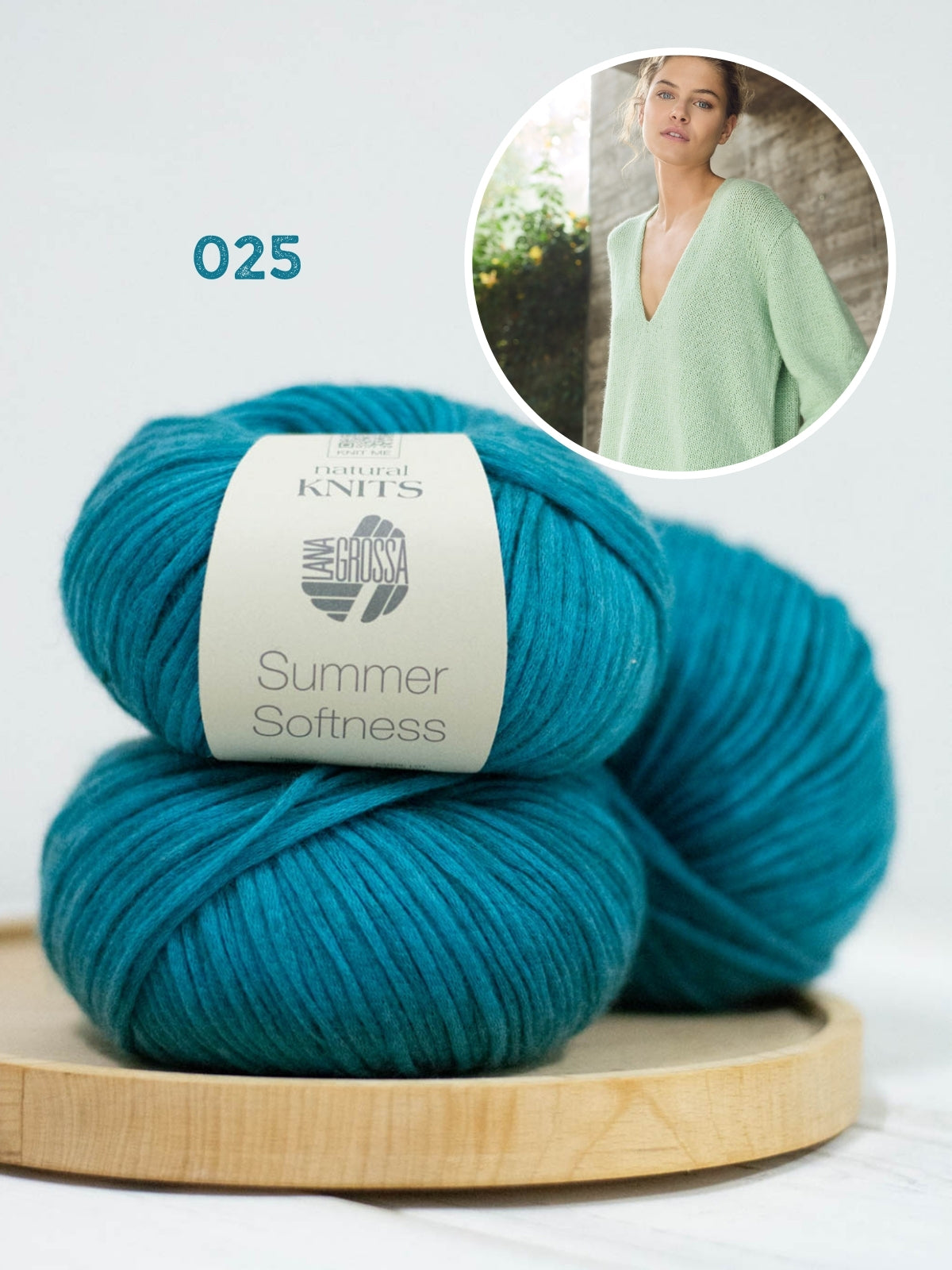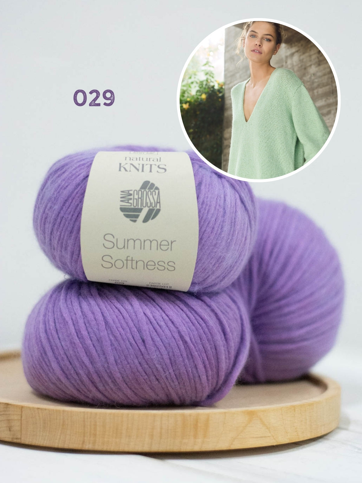 Het pakket bestaat uit 8/9/10/11 bollen Summer Softness en het Lookbook 20 magazine van Lana Grossa. De benodigde breinaalden (6mm) kun je hieronder toevoegen aan je winkelmandje.