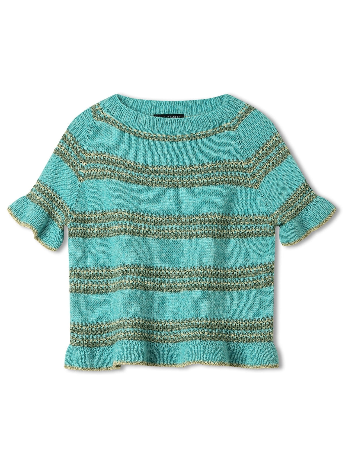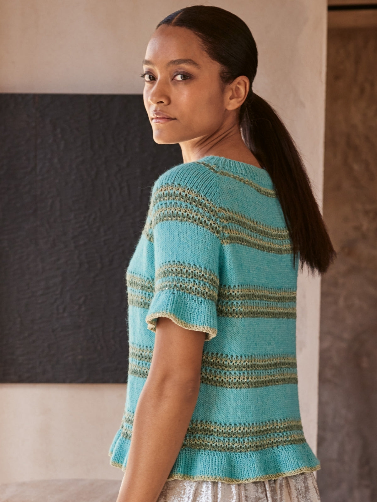 Dit shirt wordt top-down in het rond gebreid en heeft uitlopende boorden. De dunne streepjes worden met pailletten en textuur gebreid.