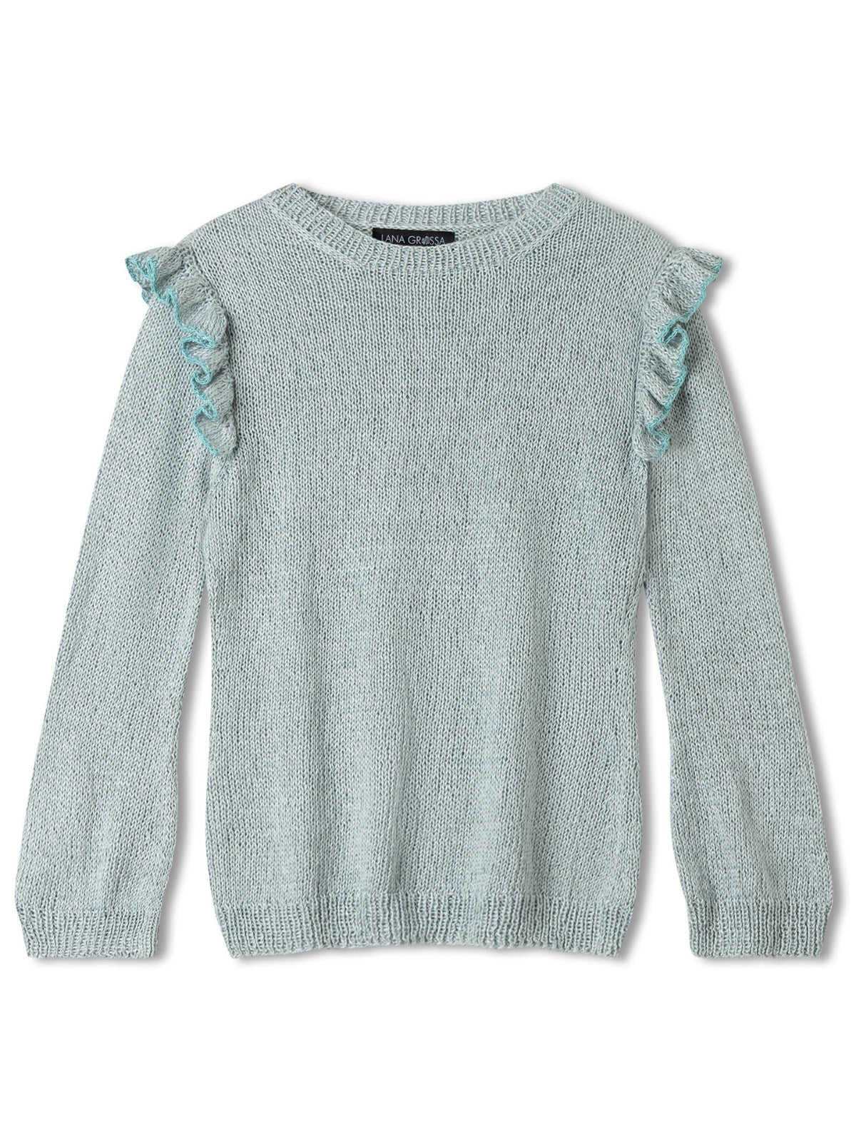 Dit simpele truitje is heel schattig dankzij de ruches op de schouder. Deze kant je af met Filo Paillettes, om een kleine sprankeling toe te voegen.