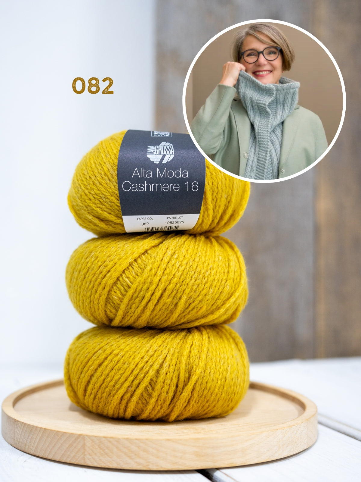 Deze stola wordt gebreid met Alta Moda Cashmere 16, dit garen bestaat uit 78% merinowol, 12% kasjmier en 10% polyamide. De col heeft een omtrek van ca. 60 cm en wordt ca. 50-55 cm lang.