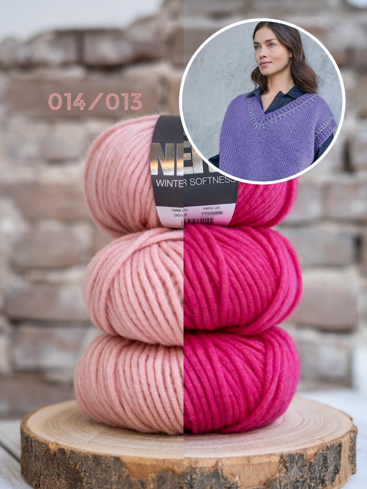 Het pakket bestaat uit 8/9/10/11 bollen Winter Softness in 2 verschillende kleuren en het Lookbook 19 magazine van Lana Grossa. De benodigde breinaalden (korte rondbreinaalden 7mm en 8mm, naaldpunten 7mm en 8mm met draad 80 en/of 100 cm) kun je hieronder toevoegen aan je winkelmandje.