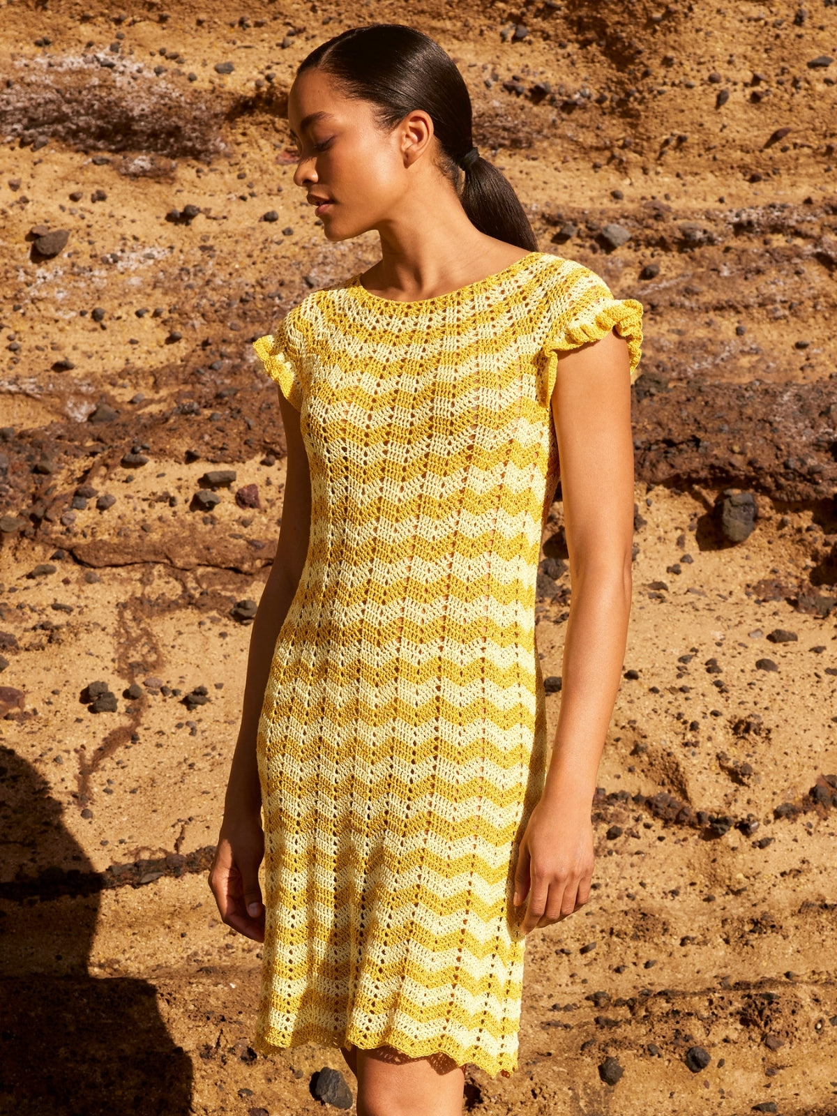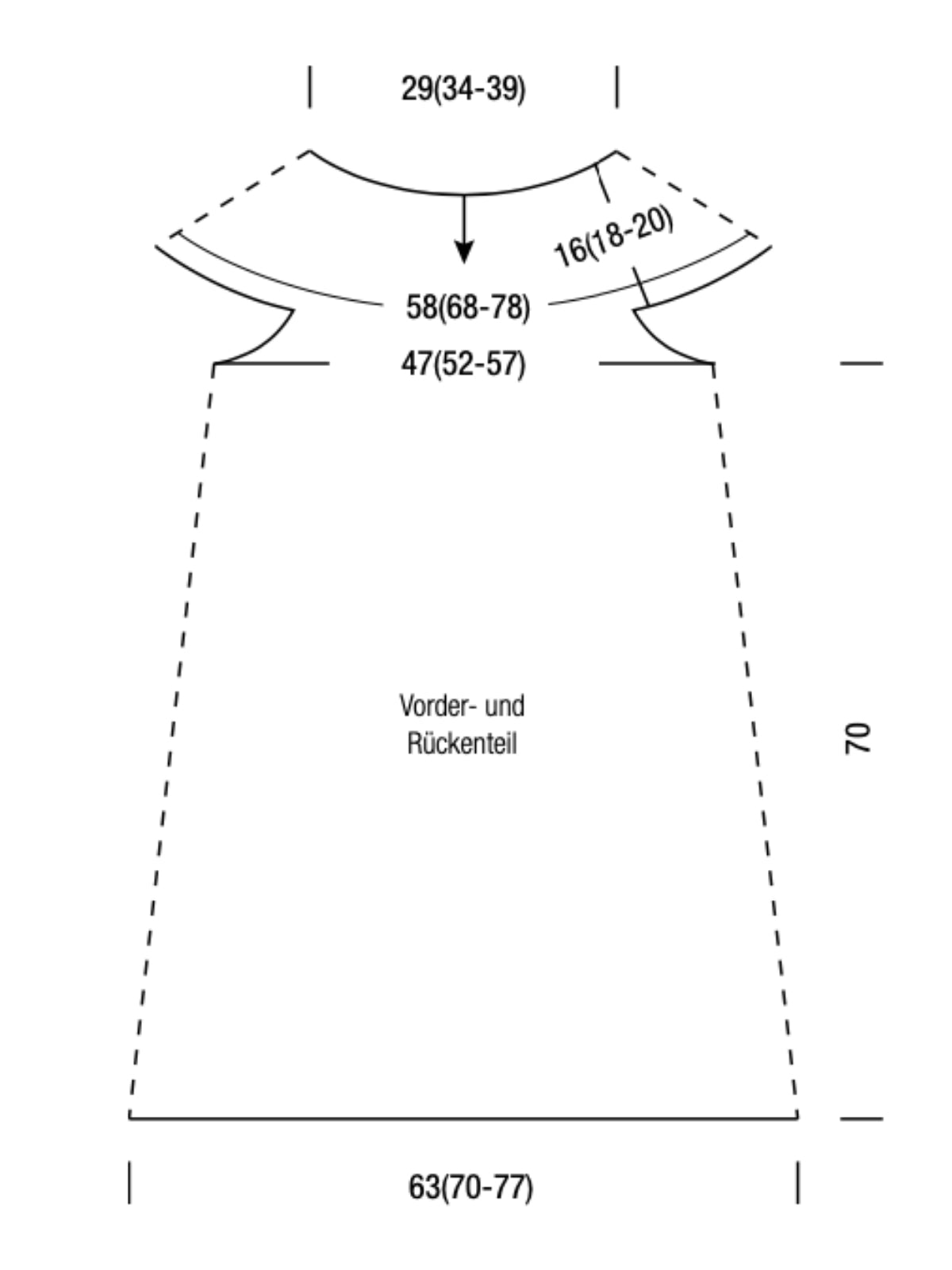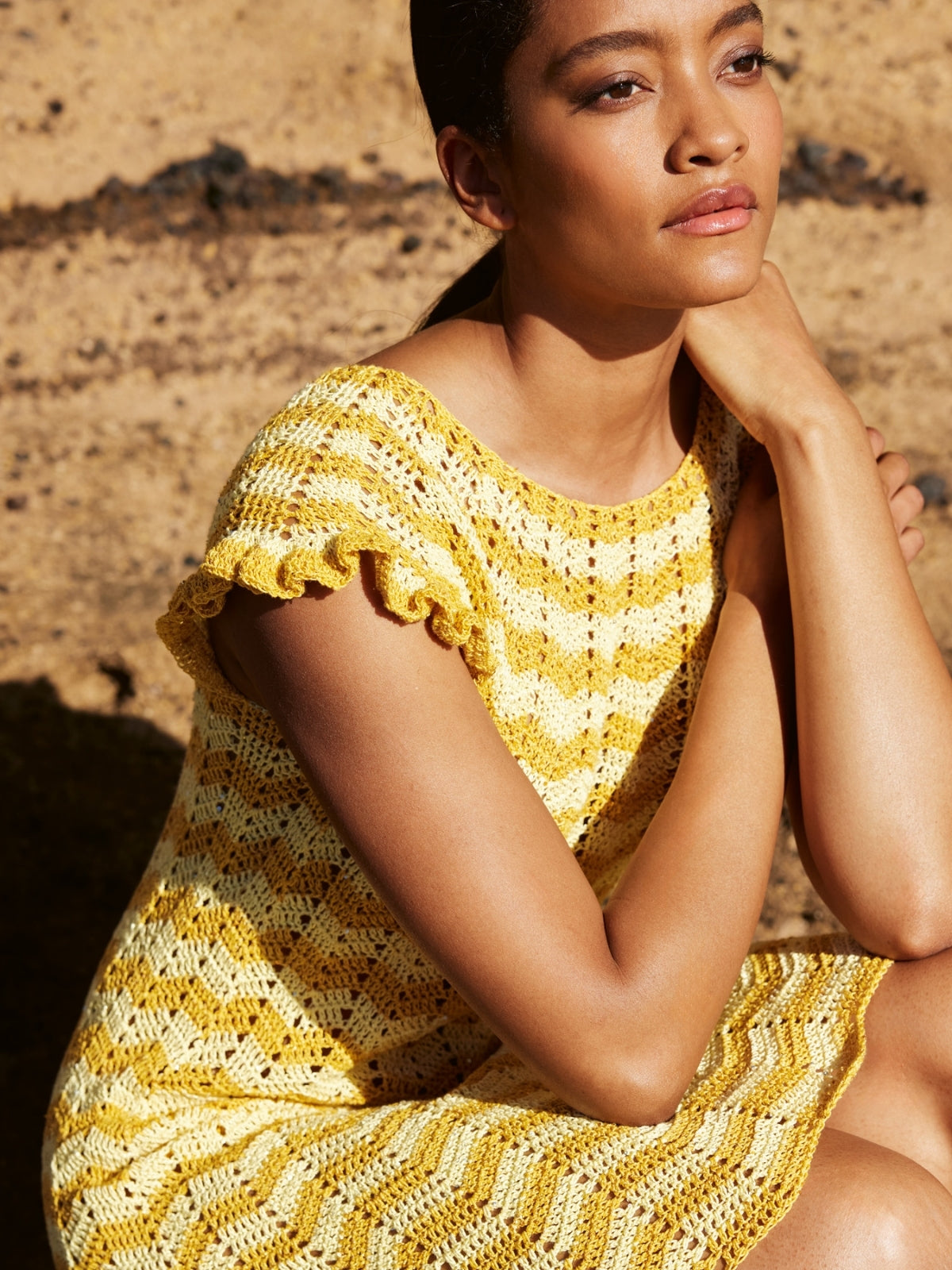 De jurk wordt gebreid met Natural Superkid Tweed (60% superkid mohair, 30% zijde, 7% katoen en 3% polyester) en Filo Paillettes (55% katoen, 39% polyester en 6% polyamide). Het patroon is uitgeschreven in maat 36 t/m 50.
